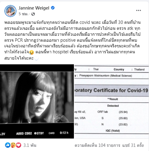 “พลอยชมพูจะมาแจ้งกับทุกคนว่าตอนนี้ติด covid นะคะ เมื่อวันที่ 30 คนที่บ้านตรวจแล้วเจอเชื้อ แต่เราเองยังไม่มีอาการเลยแยกกักตัวไปก่อน ตรวจ atk ทุกวัน ผลออกมาเป็นลบจนมาเมื่อวานที่ตัวเองเริ่มมีอาการปวดหัวเป็นไข้เลยรีบไปตรวจ PCR ปรากฏว่าผลออกมา positive ตอนนี้แจ้งคนที่ใกล้ชิดทุกคนที่พบเจอในช่วงอาทิตย์ที่ผ่านมาเรียบร้อยแล้ว ต้องขอโทษทุกคนจริง ๆ นะคะ ถ้าเกิดทำให้กังวลใจ ตอนนี้หา hospitel เรียบร้อยแล้ว อาการไม่แย่มากทุกคนสบายใจได้นะคะ”