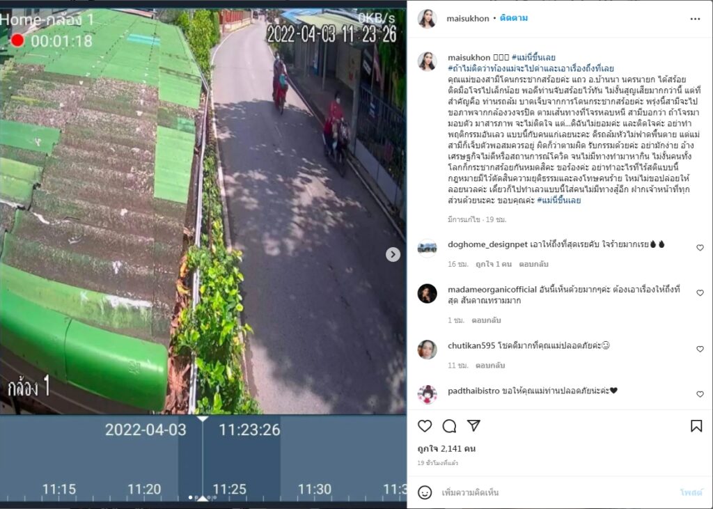 “แม่นี่ขึ้นเลย ถ้าไม่ติดว่าท้องแม่จะไปด่าและเอาเรื่องถึงที่เลย คุณแม่ของสามีโดนกระชากสร้อยค่ะ แถว อ.บ้านนา นครนายก ได้สร้อยติดมือโจรไปเล็กน้อยพอดีท่านจับสร้อยไว้ทัน ไม่งั้นสูญเสียมากกว่านี้ แต่ที่สำคัญคือ ท่านรถล้ม บาดเจ็บจากการโดนกระชากสร้อยค่ะ