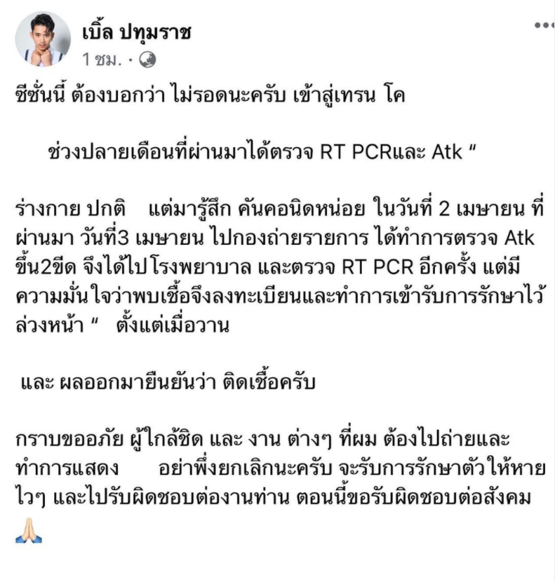 ตั้งแต่เมื่อวาน และผลออกมายืนยันว่า ติดเชื้อครับ กราบขออภัย ผู้ใกล้ชิด และงานต่าง ๆ ที่ผม ต้องไปถ่ายและทำการแสดง อย่าเพิ่งยกเลิกนะครับ จะรีบการรักษาตัวให้หายไว ๆ และไปรับผิดชอบต่องานท่าน ตอนนี้ขอรับผิดชอบต่อสังคม” ท่ามกลางแฟนคลับเข้ามาแสดงความเป็นห่วงอย่างมากมาย