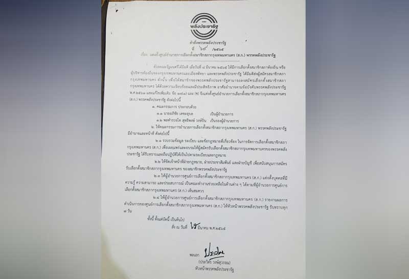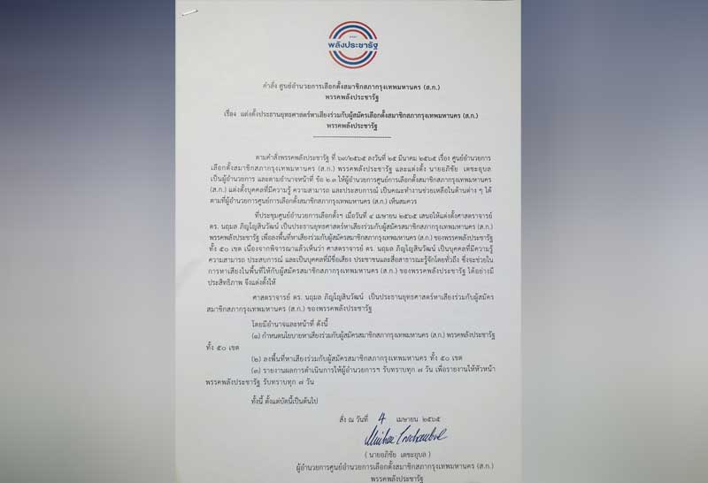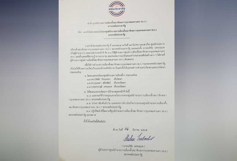 (ส.ก.)พรรคพลังประชารัฐ ลงนามแต่งตั้งตนเป็นประธานยุทธศาสตร์หาเสียงร่วมกับผู้สมัครเลือกตั้งสมาชิกสภากรุงเทพมหานคร (ส.ก.) โดยระบุว่า ตนไม่รับตำแหน่งใด ๆ