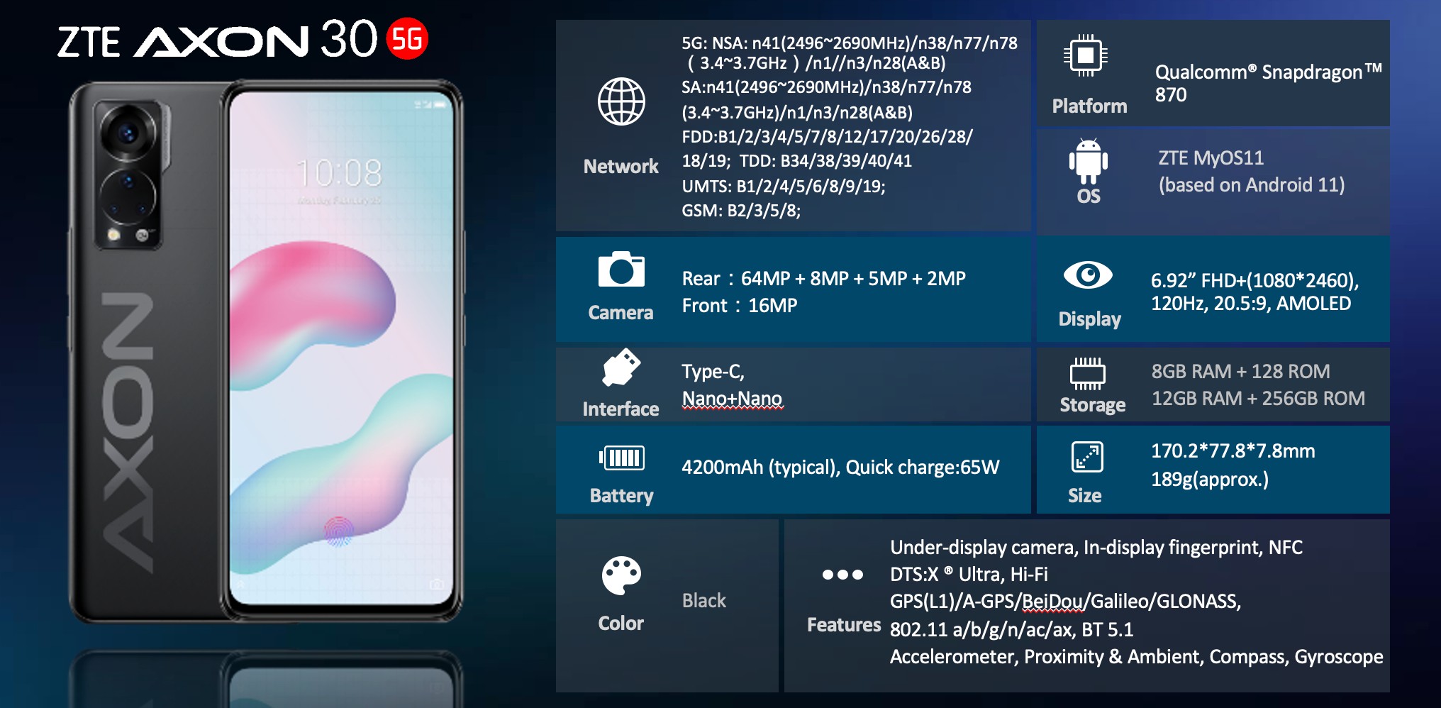 4.Axon 30 5G จอใหญ่ขนาด 6.92 นิ้ว FHD+ AMOLED ชิปเซ็ต Qualcomm® Snapdragon 870 ระบบปฏิบัติการ ZTE MyOS11 บน Android 11 กล้องหลัง 4 ตัว ความละเอียด 64MP + 8 MP + 5MP + 2MP พร้อมแฟลช กล้องหน้า 16MP แบตเตอรี่ 4200 mAh รองรับการชาร์จไว 55W 2 ซิม (Nano SIM) 5G ซึ่งคาดว่าจะนำมาจำหน่ายทั้งรุ่นหน่วยความจำภายใน ROM 8GB RAM 128 GB และรุ่นหน่วยความจำภายใน ROM 12GB RAM 256 GB ราคาประมาณ 12,990 บาท และ 17,990 บาท ตามลำดับ