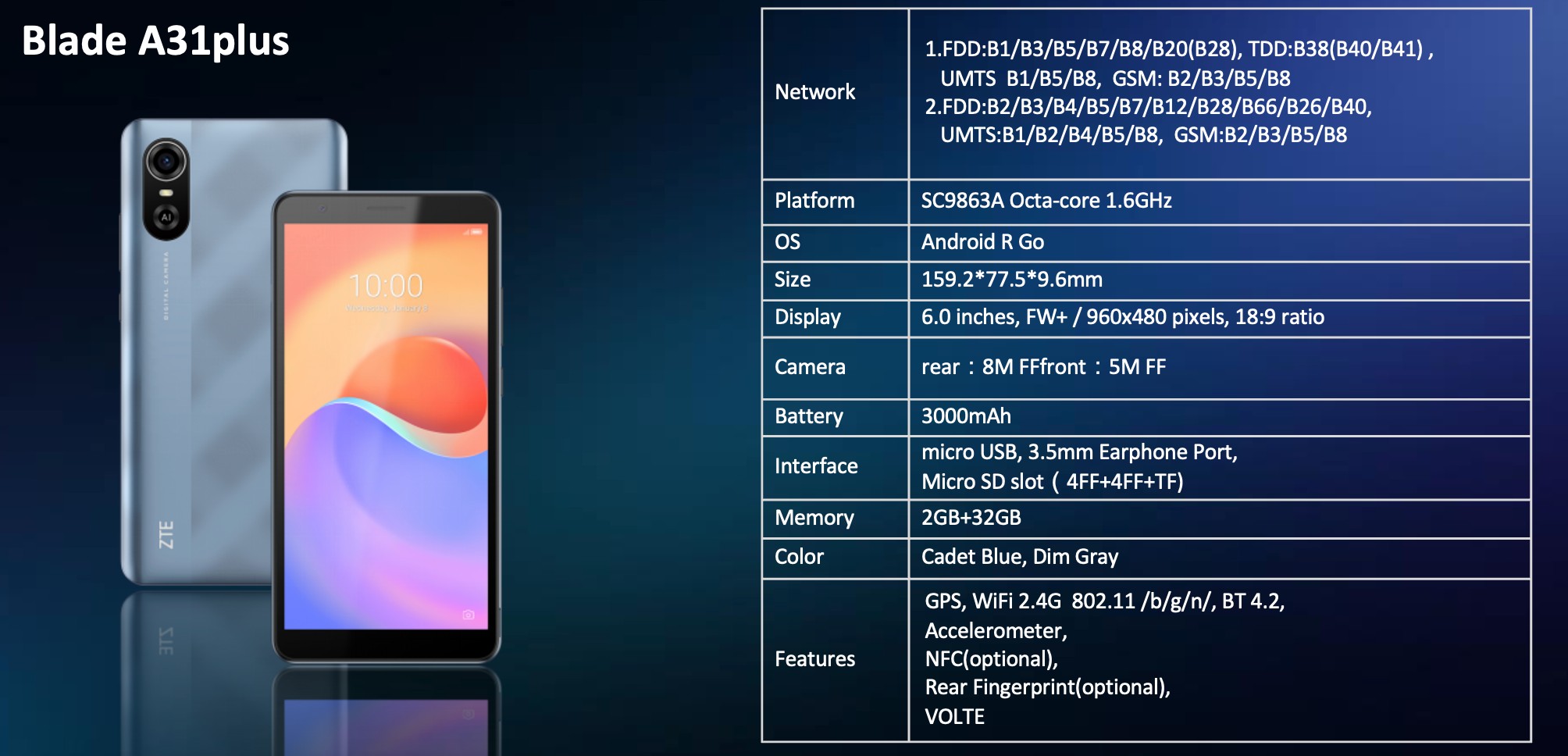 1.ZTE Blade A31 Plus จอใหญ่ขนาด 6 นิ้ว กล้องหลัก 8MP AI พร้อม LED แฟลช กล้องหน้า 5MP แบตเตอรี่ 3000mAh รองรับการชาร์จ 10W รองรับ Google Assistant 2 ซิม (Nano SIM) 4GLT หน่วยความจำภายใน RAM 2GB ROM 32 GB ราคา 2,599 บาท