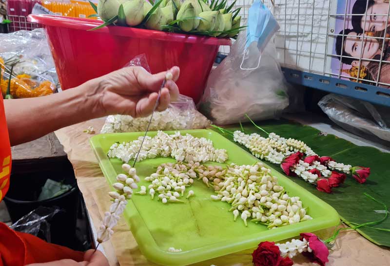 บรรยากาศมีลูกค้ามาเลือกซื้อพวงมาลัยดอกมะลิกันอย่างคึกคัก จนต้องมีการเร่งร้อยพวงมาลัยกันตลอดทั้งวัน เพื่อให้เพียงพอต่อความต้องการของลูกค้า ซึ่งนางอุทัย ศรพระอินทร์ เจ้าของร้านแม่บุญช่วย บอกว่าในช่วงเทศกาลสงกรานต์ทุกปีจะมีลูกค้าแวะมาเลือกซื้อพวงมาลัย และสิ่งของที่จะต้องนำไปประกอบพิธีสงกรานต์กันอย่างเนืองแน่น ส่วนใหญ่จะเป็น พวงมาลัยดอกมะลิ ซึ่งที่ร้านจะมีขายตั้งแต่พวงละ 20 บาท ไปจนถึง 200 บาท แล้วแต่ขนาด