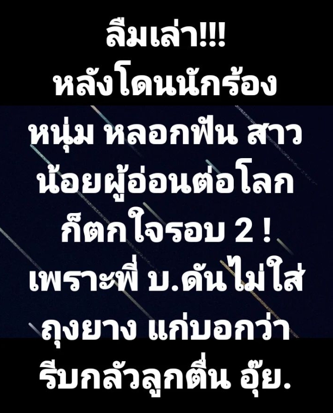 นอกจากนี้ เค๋า ทีวีพูล ยังโพสต์ข้อความแฉอีกว่า“ลืมเล่า!!! หลังโดนนักร้องหนุ่มร้องฟัน สาวน้อยผู้อ่อนต่อโลก ก็ตกใจรอบ 2 ! เพราะพี่ บ. ดันไม่ใส่ถุงยาง แกบอกว่ารีบ กลัวลูกตื่น อุ๊ย.”