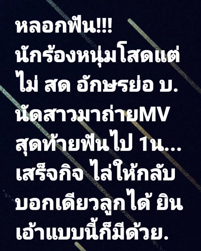 “หลอกฟัน!!!นักร้องหนุ่มโสดแต่ไม่ สด อักษรย่อ บ.นัดสาวมาถ่ายMVสุดท้ายฟันไป 1น…เสร็จกิจ ไล่ให้กลับบอกเดียวลูกได้ ยินเอ้าแบบนี้ก็มีด้วย”