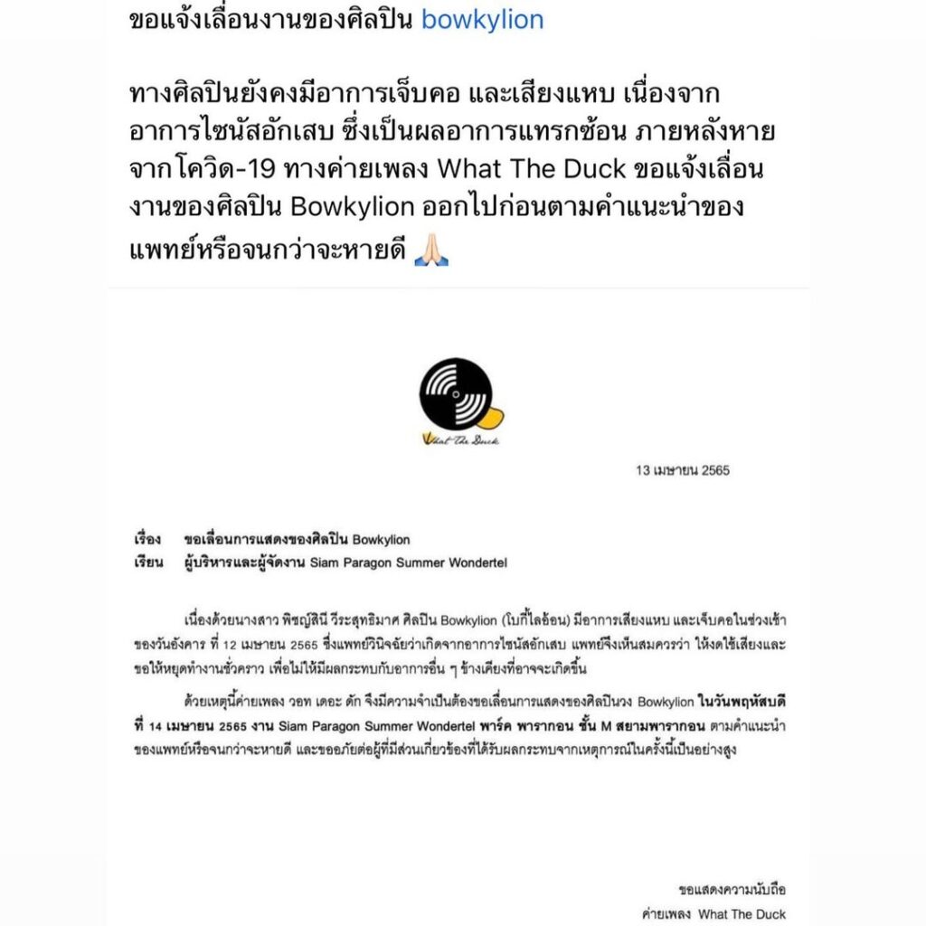 “อาการแทรกซ้อนหลังจากหาย covid-19 คือโพรงจมูกอักเสบและไซนัส ทำให้มีความจำเป็นที่จะต้องเลื่อนงานออกไปก่อนตามคำแนะนำของแพทย์หรือจนกว่าจะหายดีค่ะ กราบขออภัยทางผู้จัดงานและขออภัยแฟนเพลงเป็นอย่างยิ่งค่ะ ปวดใจทุกครั้งที่ต้องยกเลิกงาน แต่การเจ็บป่วยก็เป็นเรื่องยากเกินจะควบคุม โบเสียใจมากๆเลย อยากเจอทุกคนมากจริงๆ ขอโทษด้วยจริงๆ นะคะ 😭🙏🏽🤍 ขอบคุณแฟนๆ ที่คอยติดตามส่งกำลังใจให้ตลอดเลยนะคะ รักมากๆเลย 🌻”