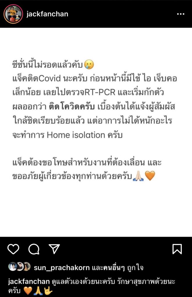 ซึ่ง หนุ่ม แจ็ค ได้โพสต์ข้อความเอาไว้ว่า “ ซีซั่นนี้ไม่รอดแล้วคับ แจ็คติดCovid นะครับ ก่อนหน้านี้มีไข้ ไอ เจ็บคอเล็กน้อย เลยไปตรวจRT-PCR และเริ่มกักตัวผลออกว่า ติดโควิดครับ เบื้องต้นได้แจ้งผู้สัมผัสใกล้ชิดเรียบร้อยแล้ว แต่อาการไม่ได้หนักอะไรจะทำการ Home isolation ครับ แจ็คต้องขอโทษสำหรับงานที่ต้องเลื่อน และขออภัยผู้เกี่ยวข้องทุกท่านด้วยครับ” พร้อมเขียนแคปชั่นเอาไว้อีกว่า “ดูแลตัวเองด้วยนะครับ รักษาสุขภาพด้วยนะครับ”