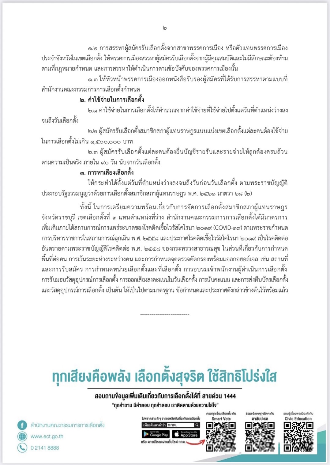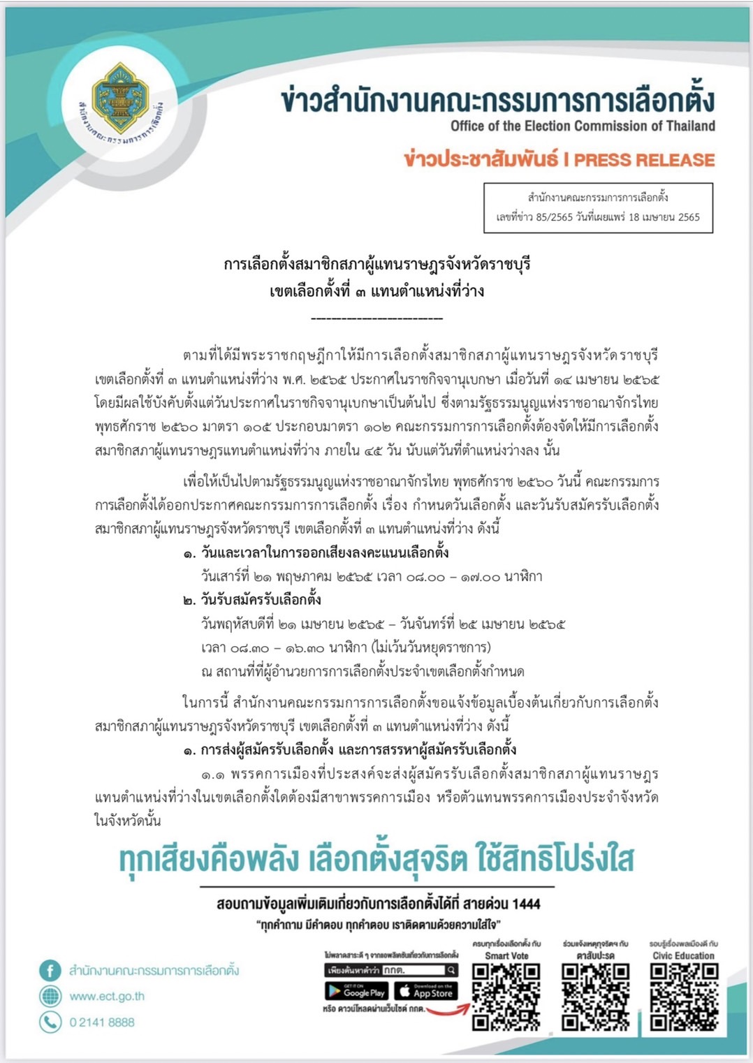 กกต. กำหนดวันเลือกตั้งซ่อม ราชบุรี 21 พ.ค.นี้ และเปิดรับสมัครรับเลือกตั้ง 21-25 เม.ย.65