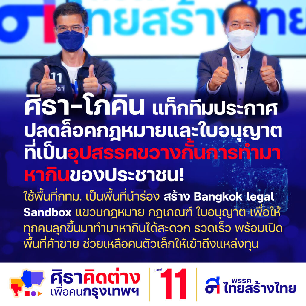 “ศิธา-โภคิน” แท็กทีม ประกาศปลดล็อค กฎหมาย-ใบอนุญาตที่เป็นอุปสรรคทำกินของประชาชน ใช้พื้นที่ กทม.นำร่อง สร้าง “Bangkok legal Sandbox”พร้อมเปิดพื้นที่ค้าขาย ช่วยคนตัวเล็ก