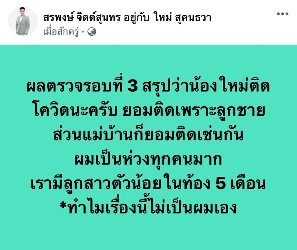 ล่าสุด “ดีเจต้น สรพงษ์” สามีของ “ใหม่ สุคนธวา” ก็ได้โพสต์ข้อความแจ้งผ่านอินสตาแกรมส่วนตัวว่า “ใหม่ สุคนธวา” ยอมติดโควิดเพื่อลูก รวมถึงแม่บ้านด้วย ขณะที่ตนเองยังรอผลตรวจ RT-PCR ยืนยันอีกครั้ง