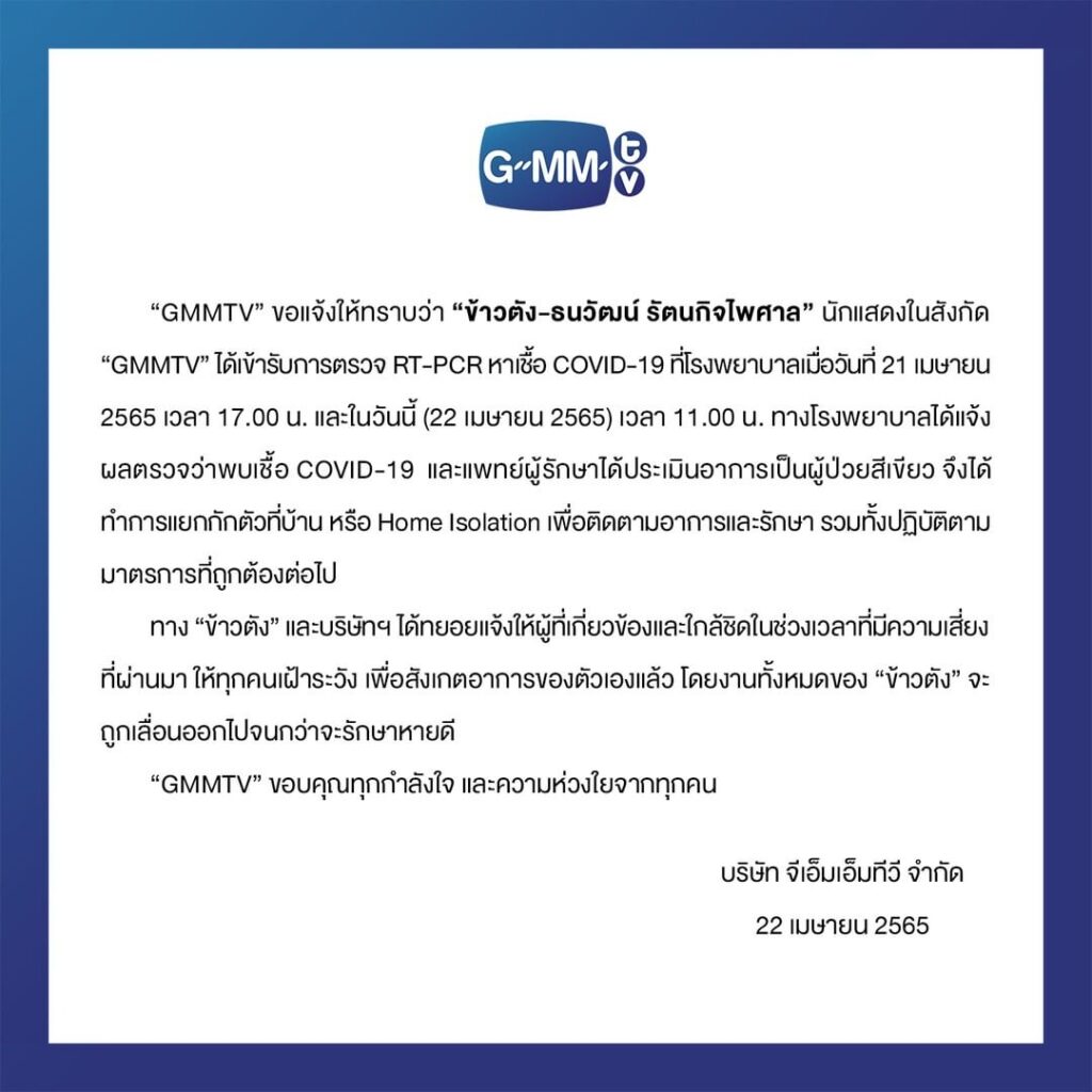 โดยทาง GMMTV ได้โพสต์ข้อความแจ้งทางอินสตาแกรมว่า “GMMTV” ขอแจ้งให้ทราบว่า “ข้าวตัง-ธนวัฒน์ รัตนกิจไพศาล” นักแสดงในสังกัด”GMMTV” ได้เข้ารับการตรวจ RT-PCR หาเชื้อ COVID-19 ที่โรงพยาบาลเมื่อวันที่ 21 เมษายน2565 เวลา 17.00 น. และในวันนี้ (22 เมษายน 2565) เวลา 11.00 น. ทางโรงพยาบาลได้แจ้งผลตรวจว่าพบเชื้อ COVID-19 และแพทย์ผู้รักษาได้ประเมินอาการเป็นผู้ป่วยสีเขียว จึงได้ทำการแยกกักตัวที่บ้าน หรือ Home Isolation เพื่อติดตามอาการและรักษา รวมทั้งปฏิบัติตามมาตรการที่ถูกต้องต่อไป