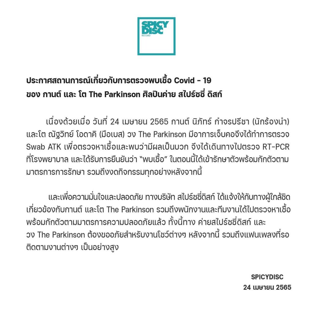 “เนื่องด้วยเมื่อ วันที่ 24 เมษายน 2565 กานต์ นิภัทร์ กำจรปรีชา (นักร้องนำ) และโต ณัฐวิทย์ โอดาคิ (มือเบส) วง The Parkinson มีอาการเจ็บคอจึงได้ทำการตรวจ Swab ATK เพื่อตรวจหาเชื้อและพบว่ามีผลเป็นบวก จึงได้เดินทางไปตรวจ RT-PCR ที่โรงพยาบาล และได้รับการยืนยันว่า “พบเชื้อ” ในตอนนี้ได้เข้ารักษาตัวพร้อมกักตัวตามมาตรการการรักษา รวมถึงงดกิจกรรมทุกอย่างหลังจากนี้