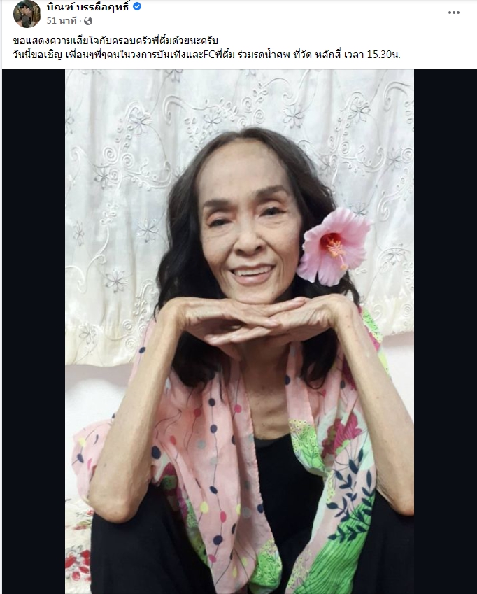 ขณะที่ “บิณฑ์ บรรลือฤทธิ์” ได้โพสต์ภาพพร้อมข้อความอาลัยว่า ขอแสดงความเสียใจกับครอบครัวพี่ติ๋มด้วยนะครับ วันนี้ขอเชิญ เพี่อนๆพี่ๆคนในวงการบันเทิงและFCพี่ติ๋ม ร่วมรดน้ำศพ ที่วัด หลักสี่ เวลา 15.30น.