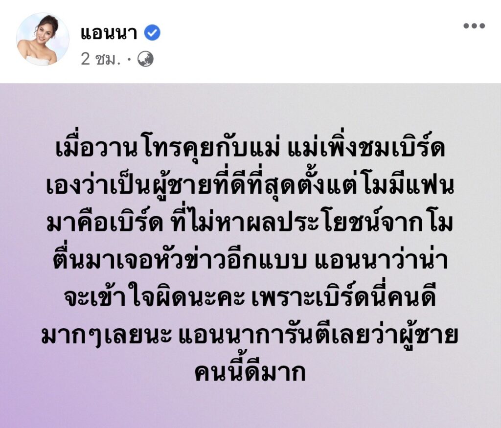ล่าสุดหนึ่งในเพื่อนสนิทอย่าง “แอนนา” ก็ได้มีการเคลื่อนไหวด้วยการโพสต์เฟซบุ๊กถึงเรื่องดังกล่าวว่า “เมื่อวานโทรคุยกับแม่ แม่เพิ่งชมเบิร์ดเองว่าเป็นผู้ชายที่ดีที่สุดตั้งแต่โมมีแฟนมาคือเบิร์ด ที่ไม่หาผลประโยชน์จากโม ตื่นมาเจอหัวข่าวอีกแบบ แอนนาว่าน่าจะเข้าใจผิดนะคะ เพราะเบิร์ดนี่คนดีมากๆเลยนะ แอนนาการันตีเลยว่าผู้ชายคนนี้ดีมาก”