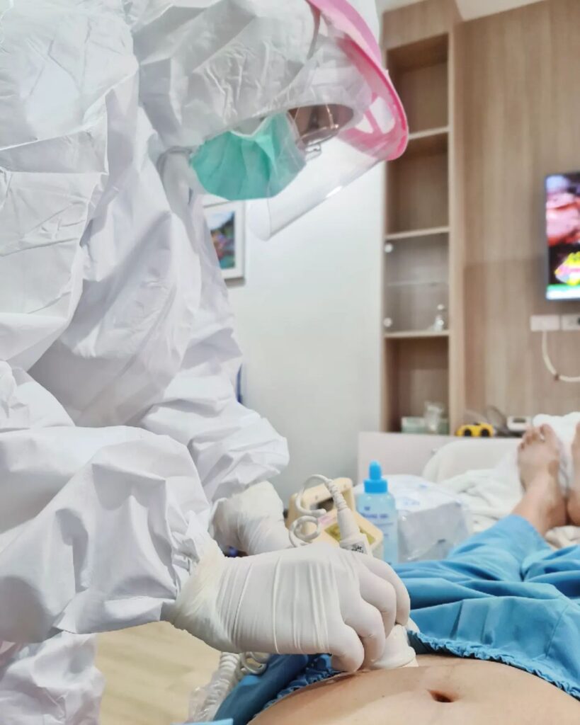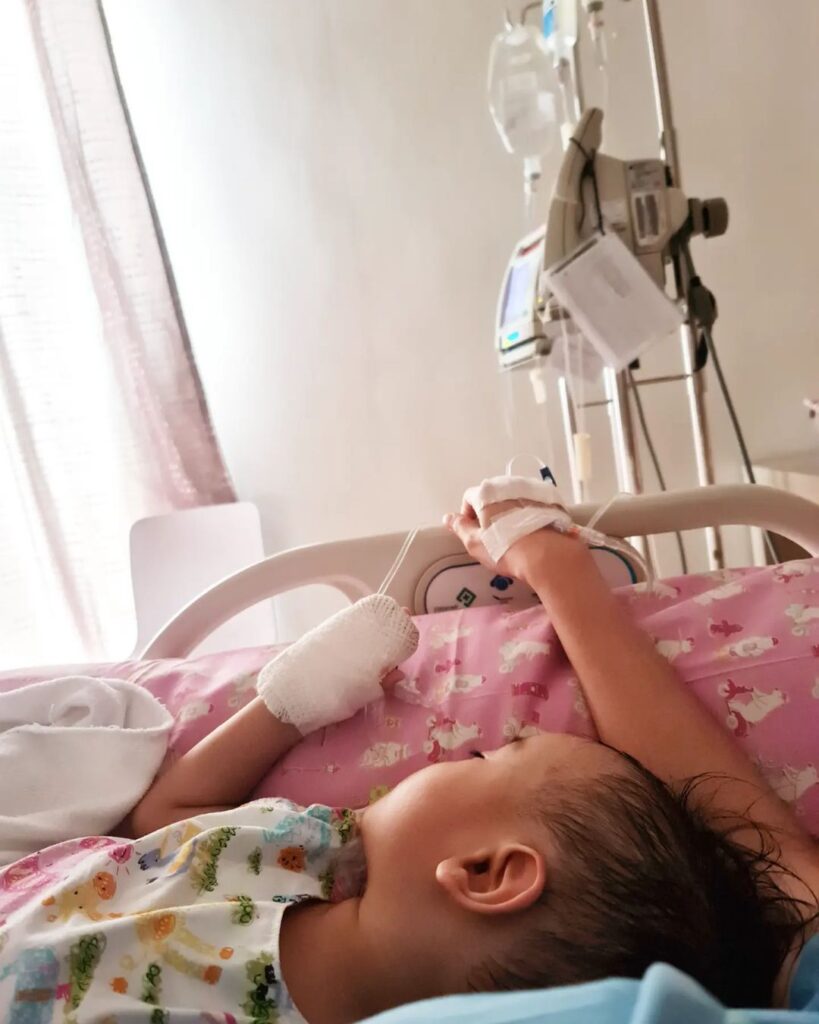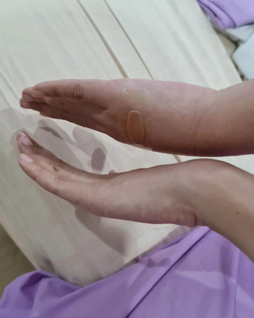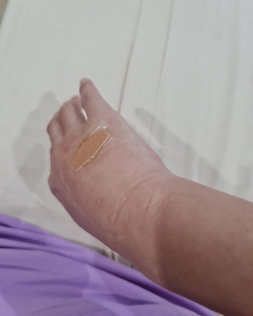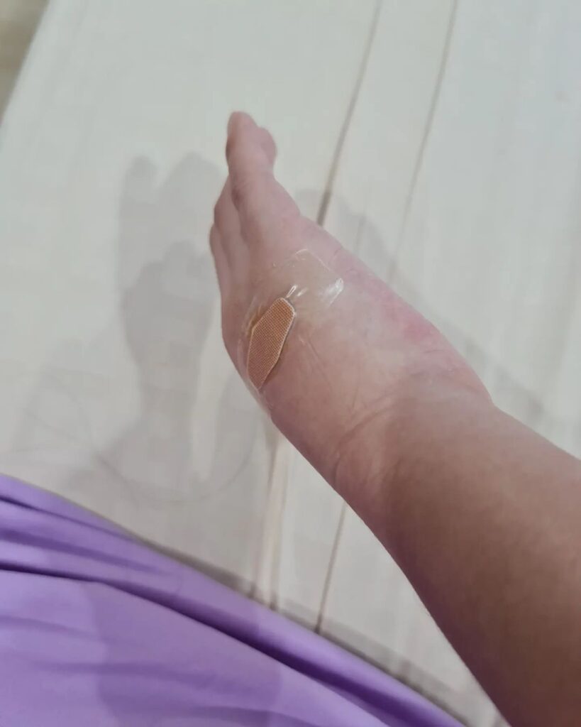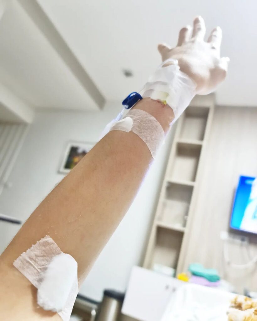 “เป็นการป่วยที่รุนแรงที่สุดตั้งแต่เกิดมาเลย อาจจะเป็นเพราะแม่ท้องด้วย กินยาเม็ดก็ไม่ได้ ต้องให้ยาทางเส้นเลือดอย่างเดียว วันล่ะกี่เข็ม บอกเลย…นับไม่ถ้วน นับไม่ไหว สลับมือซ้ายขวา สลับแขน ซ้ายขวา เพราะแขนบวม มือบวม เส้นแตก ที่เห็นนี่สภาพแขนเดียวนะ แม่ท้องด้วย เลยทำให้ภูมิตก อาการก็จะหนักกว่าคนปกติทั่วไป เป็นแบบนี้มา6วันแล้ว วันนี้ทั้งวันโดนยาจนมึน จนเบลอ หน้ามืด แบบมืดตึ๊บ จะเป็นลม จะสลบกางอากาศให้ได้ ไม่มีแรงเดิน ลูกคนโตก็เข้าแต่เต้า จนแม่ผลิตน้ำนมไม่ทันแล้ว ขวดลูกก็ไม่ค่อยจะกิน กลางคืนแม่ก็นอนไม่หลับ เพราะไอตลอด วัดไข้ลูกตลอดด้วย โควิดนี่ร้ายแรงจริง คนท้องจะอ่อนแออยู่แล้ว ยิ่งไปกันใหญ่ เข็ดมาก ไม่ขอติดรอบ2 แม่บอกเลย อึดแค่ไหน ถึกแค่ไหน แกร่งแค่ไหน ก็พ่ายโควิด🥺🤒😷🤕🤮”