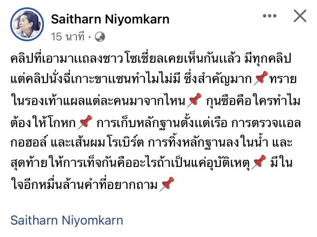 ซึ่งจากการแถลงข่าวดังกล่าว ก็ยังคงสร้างความสงสัยให้กับหลายๆคน รวมถึง “ต่าย สายธาร” หนึ่งในทีมกู้ภัยที่ช่วยกันตามหาร่างแตงโม ได้ออกมาโพสต์เฟสบุ๊คว่า “คลิปที่เอามาเเถลงชาวโซเชี่ยลเคยเห็นกันเเล้ว มีทุกคลิปแต่คลิปนั่งฉี่เกาะขาเเซนทำไมไม่มี ซึ่งสำคัญมาก📌ทรายในรองเท้าแผลแต่ละคนมาจากไหน📌 กุนซือคือใครทำไมต้องให้โกหก📌 การเก็บหลักฐานตั้งเเต่เรือ การตรวจเเอลกอฮอล์ และเส้นผมโรเบิร์ต การทิ้งหลักฐานลงในน้ำ และสุดท้ายให้การเท็จกันคืออะไรถ้าเป็นแค่อุบัติเหตุ📌 มีในใจอีกหมื่นล้านคำที่อยากถาม📌”