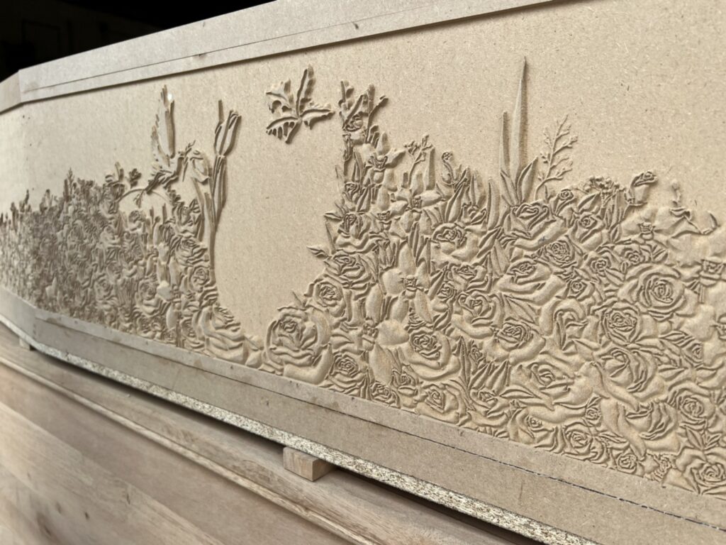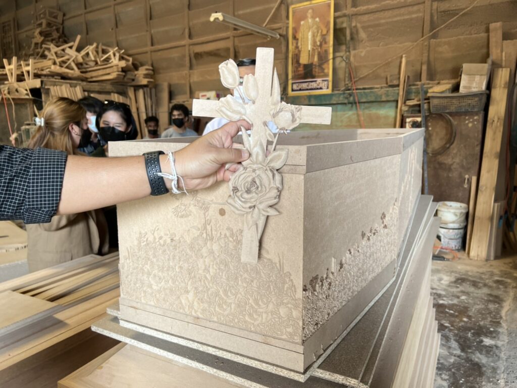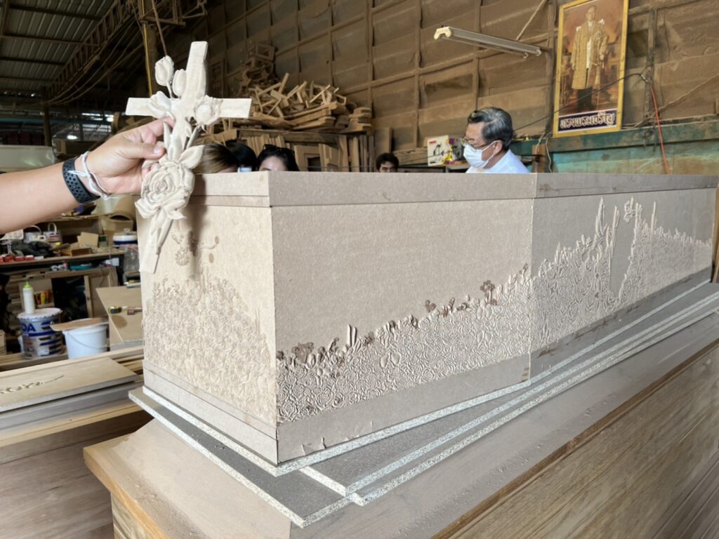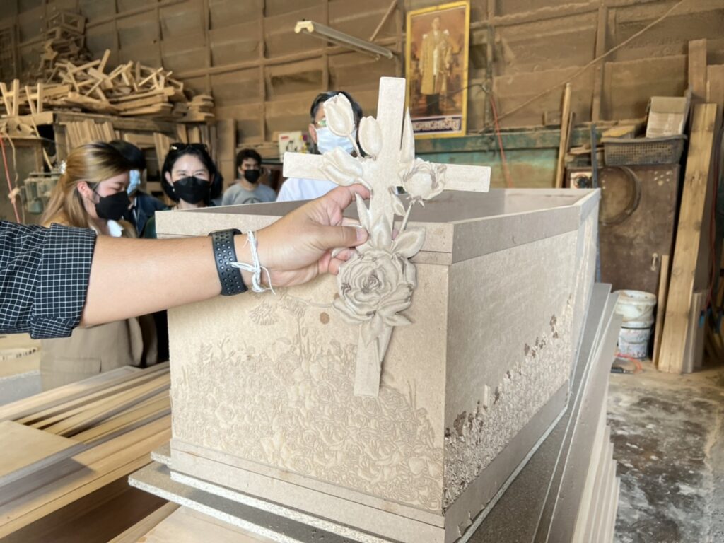ทั้งนี้ วิธีการทำเริ่มจากการร่างและดราฟมือปรับแก้เพื่อลงสรุปแบบก่อนนำมาวาดต่อในโปรแกรม3D ที่ใช้ในการลงกัดบนเครื่องCNC โดยหีบของคุณแตงโมจะเป็นการกัด3Dทั้งหมดก่อนประกอบ จึงมีระยะการทำที่ค่อนข้างละเอียดและใช้เวลา ซึ่งในช่วงขั้นตอนออกแบบทางสุริยาหีบศพ คลองหลวง ได้รับเกียรติเป็นอย่างสูงจากท่านอาจารย์ธงชัยที่คอยให้คำแนะนำกับทีมออกแบบมาโดยตลอด ในเรื่องความรู้สัญลักษณ์ ความเชื่อในทางศาสนาคริสต์ ซึ่งเป็นส่วนสำคัญอย่างมากที่ทำให้งานออกแบบครั้งนี้ออกมาเสร็จสมบูรณ์