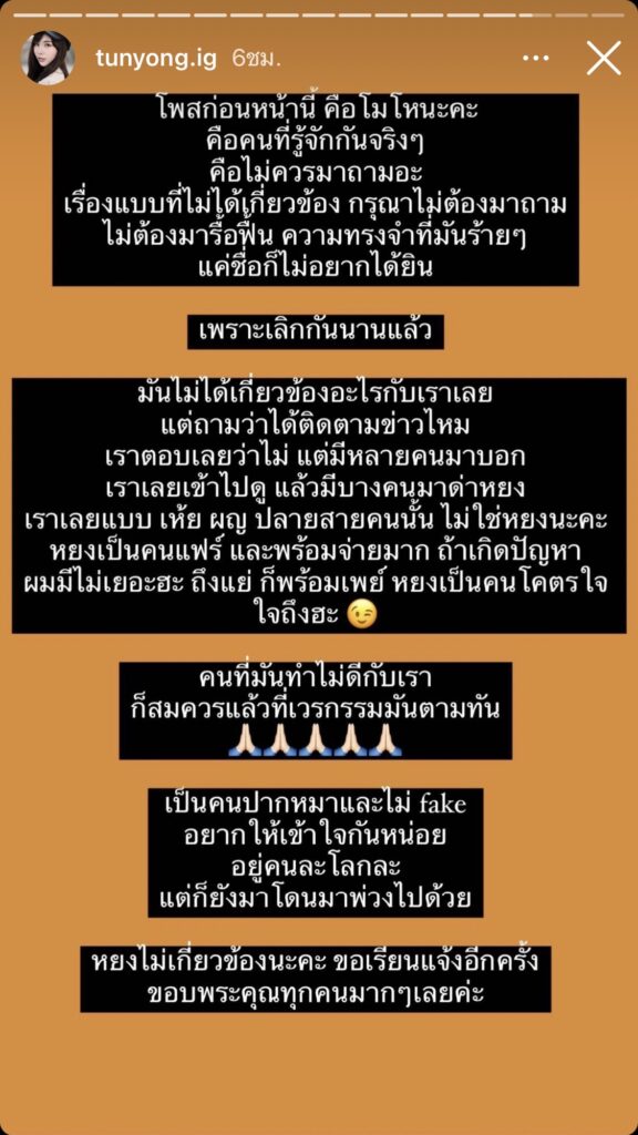 ก่อนจะโพสต์อีกอันด้วยว่า “โพสต์ก่อนหน้านี้ คือโมโหนะคะ คือคนที่รู้จักกันจริงๆ คือไม่ควรมาถามอะ เรื่องแบบนี้ไม่ได้เกี่ยวข้อง กรุณาไม่ต้องมาถาม ไม่ต้องมารื้อฟื้น ความทรงจำที่มันร้ายๆ แค่ชื่อก็ไม่อยากได้ยิน เพราะเลิกกันนานแล้ว!!!