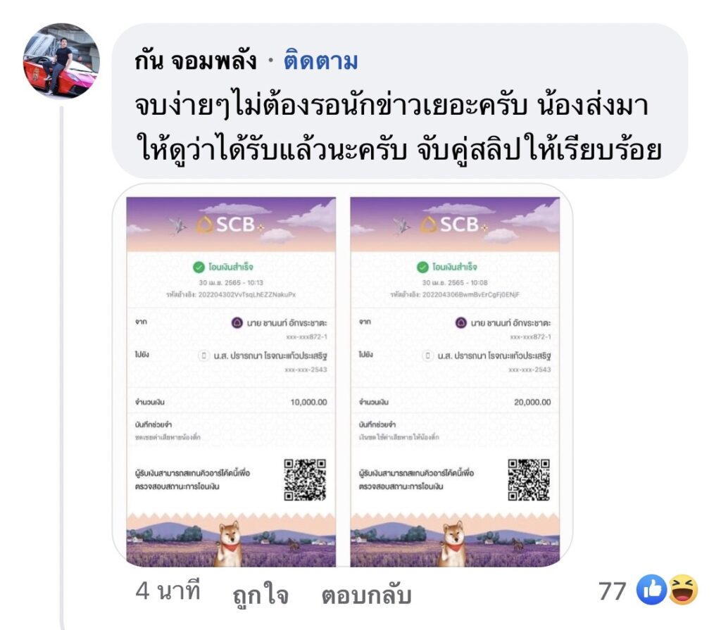 จากนั้น “กัน จอมพลัง” ทนายความที่เข้ามาช่วยเหลือคู่กรณีของดาราหนุ่มได้เข้ามาคอมเมนต์ ภาพสลิปการโอนเงินของดาราชาย ที่โอนมา 2 ครั้งเป็นจำนวนเงิน 1 หมื่นบาท และ 2 หมื่นบาท พร้อมกับบอกว่า “จบง่ายๆไม่ต้องรอนักข่าวเยอะครับ น้องส่งมาให้ดูว่าได้รับแล้วนะครับ จับคู่สลิปให้เรียบร้อย”