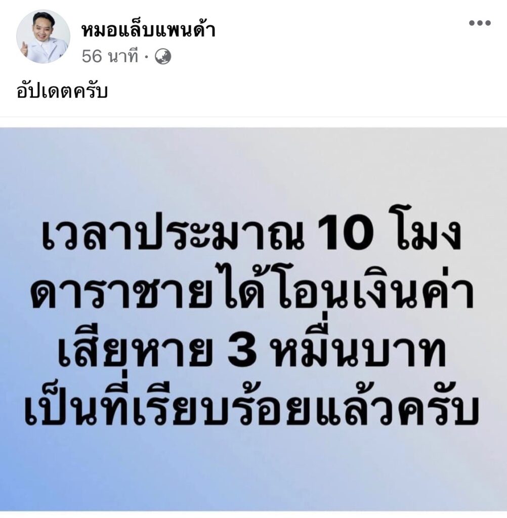 ล่าสุดทางเพจ หมอแล็บแพนด้า ได้มีการโพสต์ข้อความว่า “เวลาประมาณ 10 โมง ดาราชาย ได้โอนเงินค่าเสียหาย 3 หมื่นบาทเป็นที่เรียบร้อยแล้วครับ”
