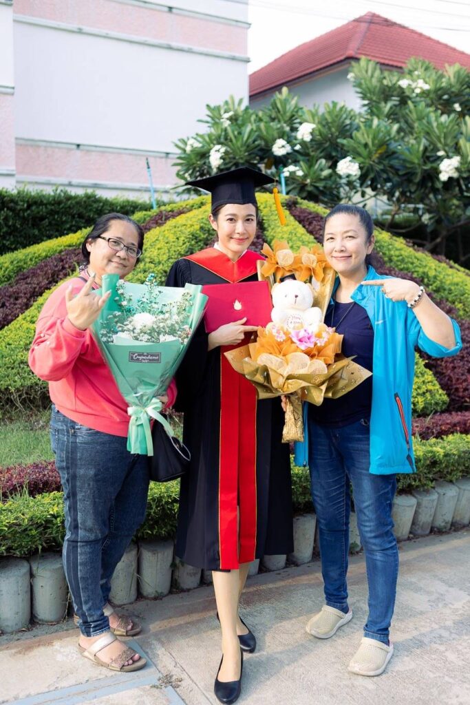 “รู้สึกดีใจและปลาบปลื้มใจมากค่ะ ถึงวันนี้สักที เพราะจบมาเกือบ 2 ปีแล้วค่ะ ก็รอเข้ารับปริญญา ด้วยสถานการณ์โควิดด้วยค่ะ มาวันนี้ก็ดีใจมากๆ เหมือนเราได้ทำความสำเร็จด้านการศึกษาไปอีกขั้นหนึ่ง ตอนนี้เปิ้ลก็เรียนต่อในระดับปริญญาโท คณะนิเทศศาสตร์ มหาวิทยาลัยกรุงเทพธนบุรี ก็เป็นอีกหนึ่งความฝันเหมือนกันค่ะ สัญญาว่าจะตั้งใจเรียน และนำวิชาที่ได้มาปรับใช้ในชีวิตประจำวัน เพราะเปิ้ลก็ยังทำงานในวงการบันเทิง มีละคร มีซีรีส์ ตอนนี้ก็รอ พระธรรมบทเดอะซีรีส์ ตอน สามาวดี ผู้ไม่ตาย ออกอากาศค่ะ ทราบมาว่าจะออกอากาศในช่วงวันวิสาขบูชาที่จะถึงนี้ เปิ้ลก็ขอฝากละครธรรมะเรื่องนี้ด้วยนะคะ ขอบพระคุณทุกกำลังใจที่มอบให้เปิ้ลด้วยค่ะ”