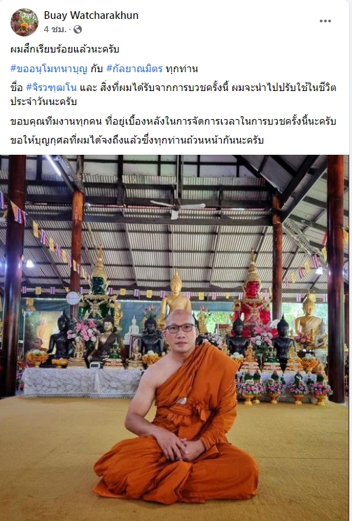และสิ่งที่ผมได้รับจากการบวชครั้งนี้ ผมจะนำไปปรับใช้ในชีวิตประจำวันนะครับ ขอบคุณทีมงานทุกคน ที่อยู่เบื้องหลังในการจัดการเวลาในการบวชครั้งนี้นะครับ ขอให้บุญกุศลที่ผมได้จงถึงแล้วซึ่งทุกท่านถ้วนหน้ากันนะครับ”