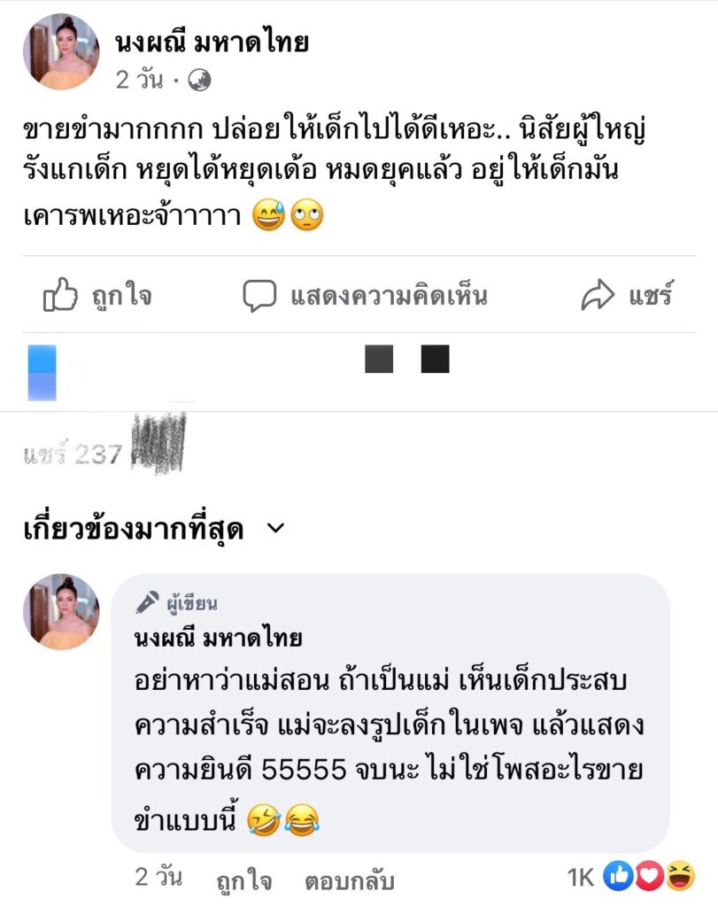 นอกจากนี้เจ้าตัวยังได้โพสต์ในคอมเมนต์อีกว่า “อย่าหาว่าแม่สอน ถ้าเป็นแม่ เห็นเด็กประสบความสำเร็จ แม่จะลงรูปเด็กในเพจ แล้วแสดงความยินดี 55555 จบนะ ไม่ใช่โพสอะไรขายขำแบบนี้ 🤣😂”