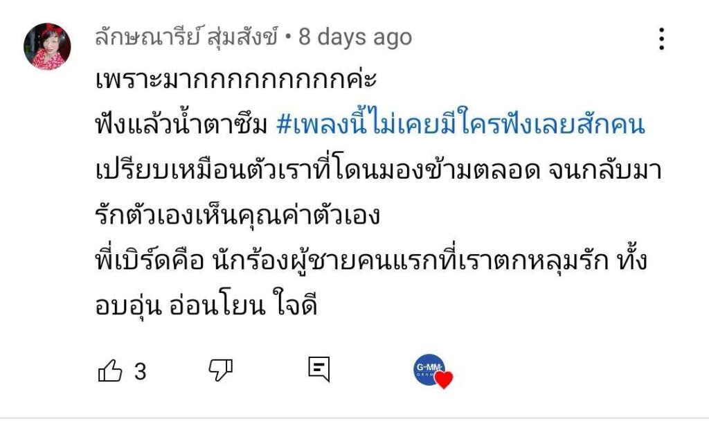 ซึ่งงานนี้แฟนๆ เพลงต่างก็พากันเข้าไปกดไลก์พร้อมใส่คอมเมนต์กันรัวๆ จนทะลักเอ่อล้นเต็มไปด้วยความรู้สึก ความผูกพัน และแรงคิดถึงสุดหัวใจ! บวกด้วยเนื้อหาเพลงที่เปรียบเหมือนกับความรักที่เปลี่ยนแปลงไป แต่ต้องจมอยู่กับความรู้สึกของคนที่ไร้ความหมายและไร้คนรอคอย โดยเนื้อเพลงที่แสนละมุน นุ่มลึก กินใจแต่แฝงไปด้วยคำคมๆ จากปลายปากกาของ “ ดี้-นิติพงษ์ ห่อนาค ” นักแต่งเพลงชื่อดัง พร้อมด้วยโปรดิวเซอร์มือฉมัง “ต้น- สุวัธชัย สุทธิรัตน์” สมการรอคอยด้วยประการทั้งปวง ใครที่คิดถึงเพลงใหม่พี่เบิร์ด ก็เข้าไปฟังเพลงใหม่ได้ทุกๆช่องทาง และขอบคุณทุกคนฟัง… ที่ทำให้ “เพลงที่ไม่มีใครฟัง” มีคนฟังมากกว่า 1,000,000+ views