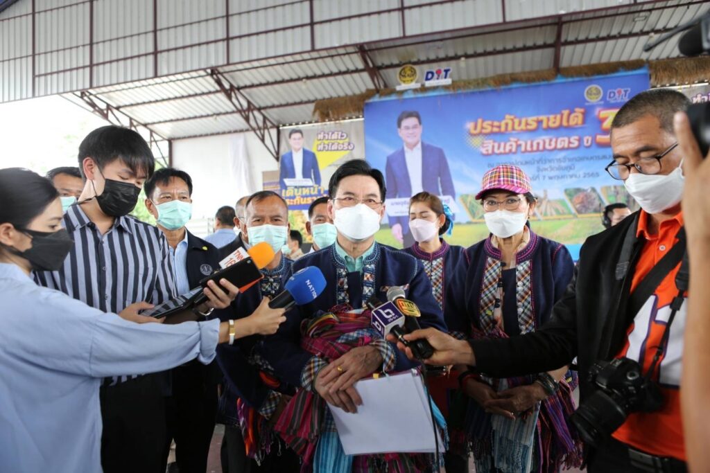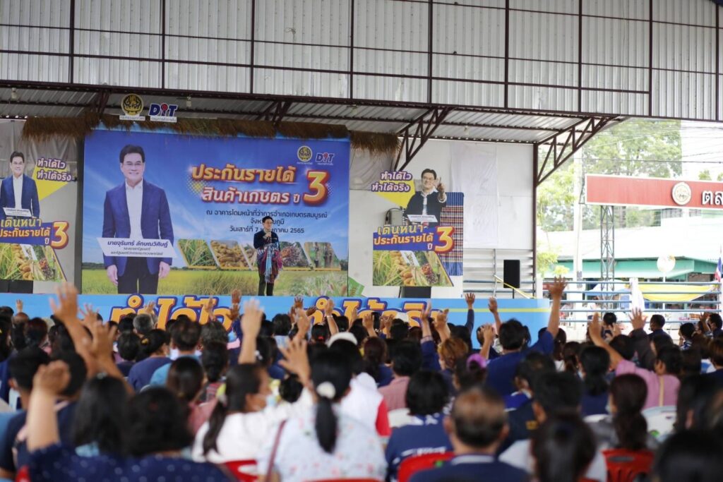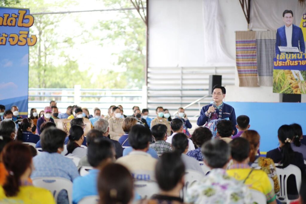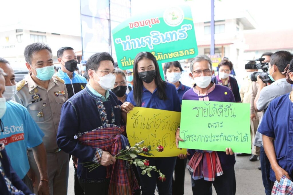นายจุรินทร์ กล่าวว่า พืชผลการเกษตรปีนี้ดีทุกตัว และที่นี่อยู่ในเขตชลประทาน ดินดี น้ำดี พืชผลดี วันนี้มันสำปะหลังกิโลกรัมละ 3.20 บาท ข้าวโพดเลี้ยงสัตว์ กิโลกรัมละ 11-12 บาท ยางก้อนถ้วย กิโลกรัมละ 30.30 บาท ซึ่งก่อนหน้านี้กิโลกรัมละ 10 บาท เมื่อเรามาแก้ไขปัญหาราคายางพาราดีขึ้น ทำให้มีเงินในกระเป๋าเพิ่มขึ้น และสำหรับผู้ที่ปลูกข้าวไว้กินขณะที่ราคาข้าวดี ราคาข้าวสารก็จะแพงขึ้น ไม่ต้องซื้อข้าวสารแพงขึ้น จะสามารถประหยัดเงินได้มากขึ้น แต่เมื่อไหร่ที่ราคาพืชเกษตรตกต่ำ จะมีนโยบายสำคัญคือนโยบายประกันรายได้เกษตรกร ซึ่งเป็นนโยบายของพรรคประชาธิปัตย์เป็นเงื่อนไขในการเข้าร่วมรัฐบาล เป็นตัวช่วยยามที่ราคาพืชเกษตรตกต่ำ ในพืชเกษตร 5 ชนิด คือ ข้าว มันสำปะหลัง ยางพารา ปาล์มน้ำมันและข้าวโพดเลี้ยงสัตว์ จะมีเงิน 2 ทาง จากราคาที่ขายในตลาดและเงินส่วนต่างจากรายได้ที่ประกัน โอนเข้าบัญชี ธ.ก.ส.โดยตรง นี่คือซุปเปอร์แมน ตัวช่วยในยามที่ข้าวราคาตก แม้ปลูกข้าวไว้กินไม่ได้เอาไปขาย ก็ได้รับเงินส่วนต่างเหมือนกัน