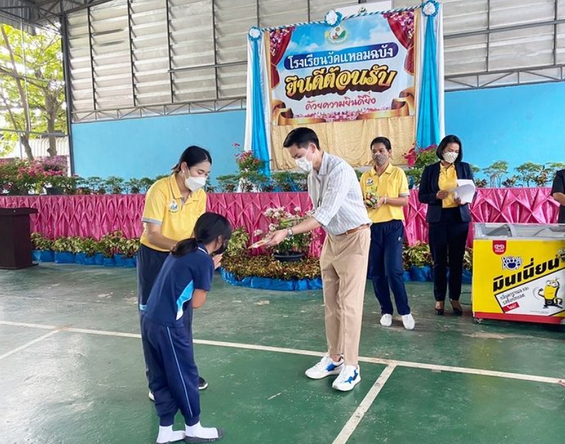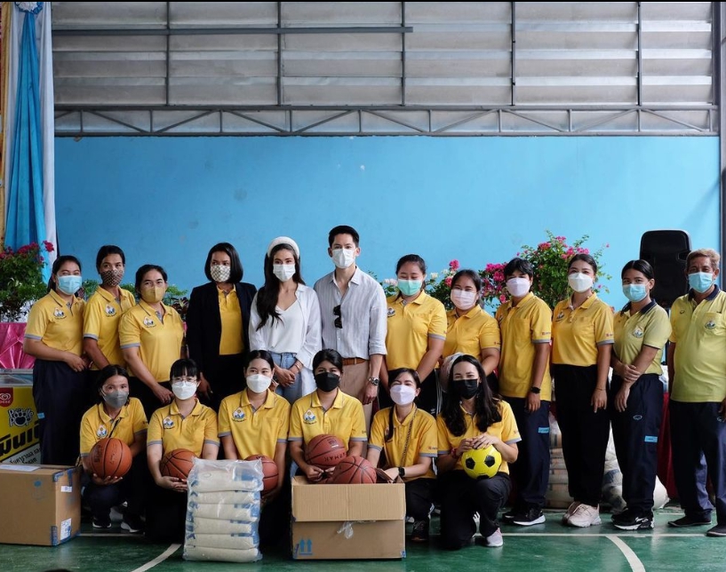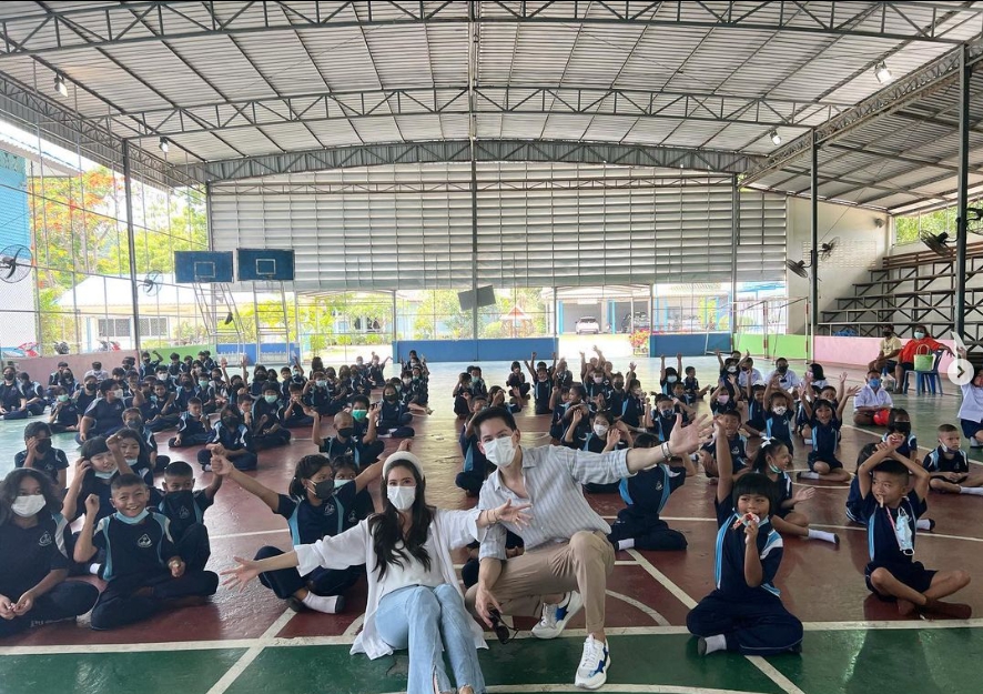 “วันนี้เราสองคนได้มามอบทุนการศึกษา อุปกรณ์การกีฬา และข้าวสาร 1,260 กิโลกรัม มามอบให้กับน้องๆโรงเรียนวัดแหลมฉบัง จังหวัดชลบุรี