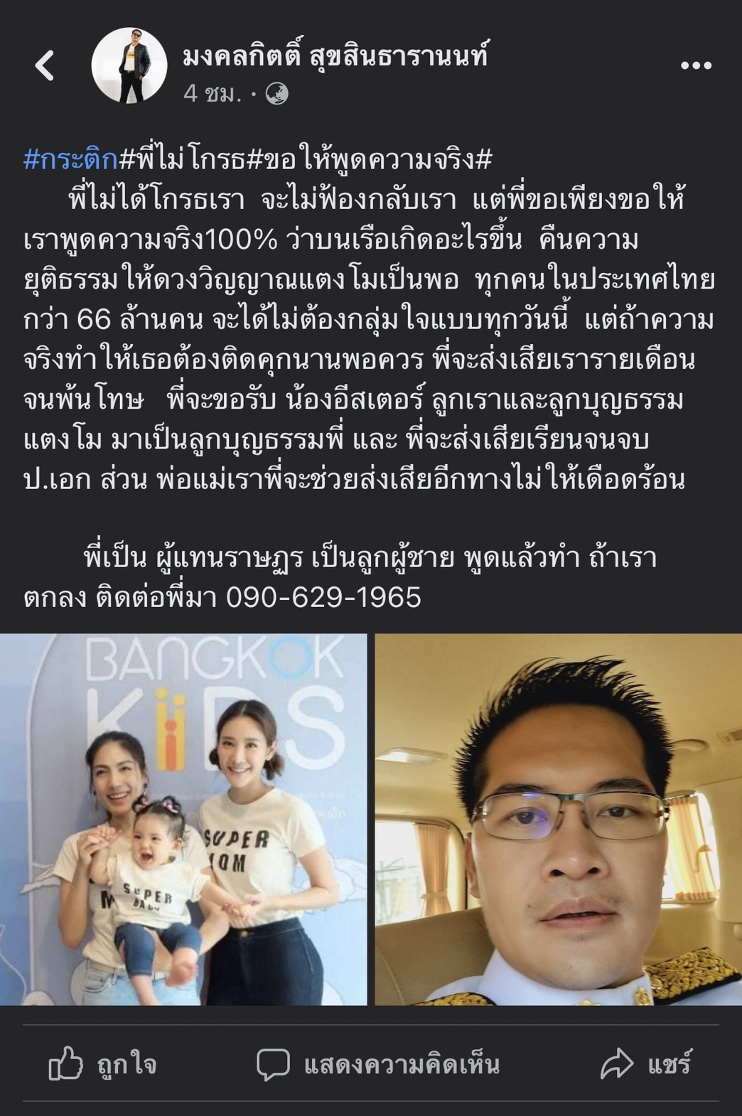 ซึ่งต่อมา นายมงคลกิตติ์ได้โพสต์ข้อความบนเฟซบุ๊กระบุว่า “#กระติก#พี่ไม่โกรธ#ขอให้พูดความจริง# พี่ไม่ได้โกรธเรา จะไม่ฟ้องกลับเรา แต่พี่ขอเพียงขอให้เราพูดความจริง100% ว่าบนเรือเกิดอะไรขึ้น คืนความยุติธรรมให้ดวงวิญญาณแตงโมเป็นพอ ทุกคนในประเทศไทยกว่า 66 ล้านคน