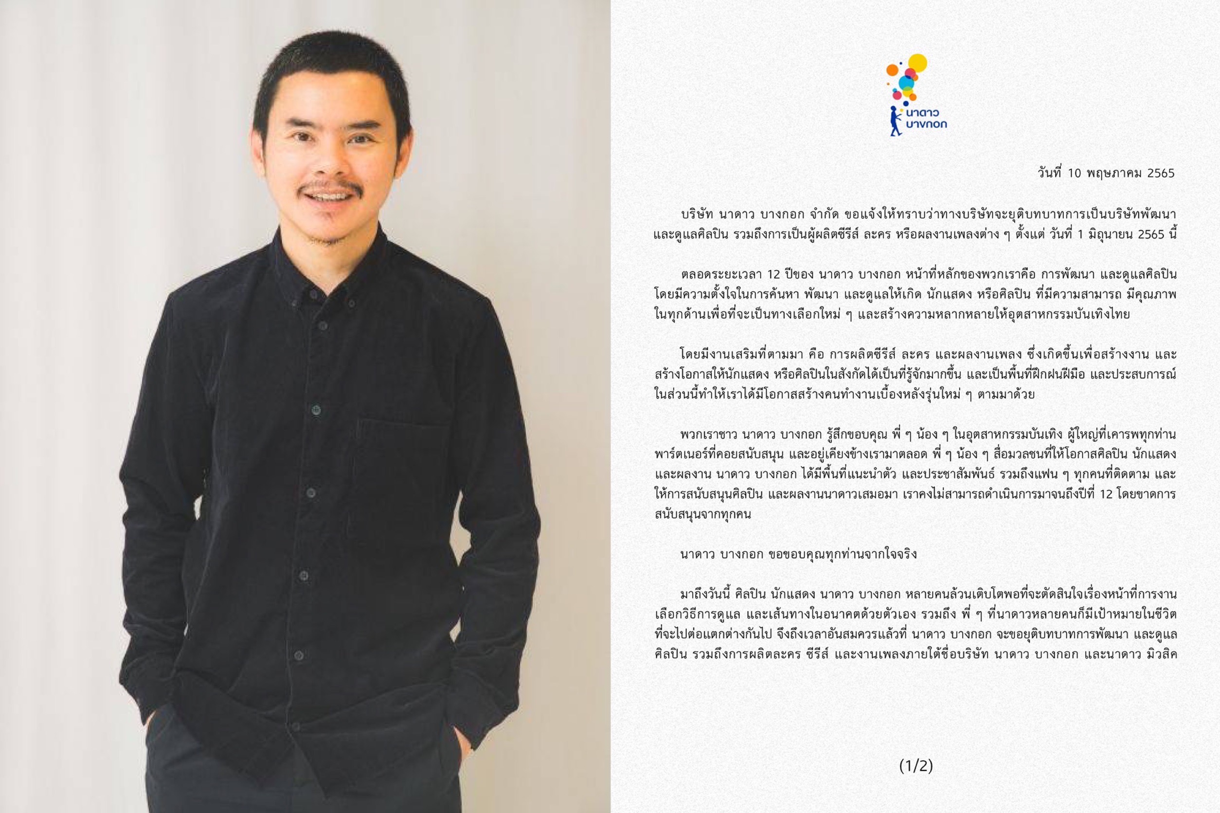 ย้ง ทรงยศ สุขมากอนันต์ กรรมการผู้จัดการ บริษัท นาดาว บางกอก จำกัด กล่าวว่า “นาดาว บางกอก ขอแจ้งให้ทราบว่าทางบริษัทจะยุติบทบาทการเป็นบริษัทพัฒนาและดูแลศิลปิน รวมถึงการเป็นผู้ผลิตซีรีส์ ละคร หรือผลงานเพลงต่าง ๆ ตั้งแต่ วันที่ 1 มิถุนายน 2565 นี้