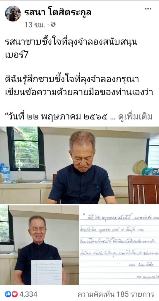 นางสาวรสนา โตสิตระกูล ผู้สมัครผู้ว่าฯ กทม. ในนามอิสระ หมายเลข 7 โพสต์เฟซบุ๊กส่วนตัว “รสนา โตสิตระกูล” หลังจากพล.ต. จำลอง ศรีเมืองแกนนำพันธมิตรประชาชนเพื่อประชาธิปไตย และอดีต ผู้ว่าฯ กรุงเทพฯ 2 สมัย เขียนจดหมายเปิดผนึกสนับสนุน นางสาวรสนา เป็นผู้ว่า กทม. ว่าตนซาบซึ้งใจที่พล.ต.จำลองสนับสนุนเบอร์7 และกรุณาเขียนข้อความด้วยลายมือของตัวเองว่า“วันที่ 22 พฤษภาคม 2565 นี้ ผมขอฝากชาว กทม.มาช่วยกันเลือก คุณรสนา เบอร์ 7 เป็นผู้ว่า กทม. เปลี่ยนผลโพลทั้งหลายได้ ให้เหมือนสมัยที่เคยเลือกผมนะครับ ผมมั่นใจว่าถ้าพร้อมกันเลือกคุณรสนาจะไม่เสียเปล่าอย่างแน่นอนครับ”