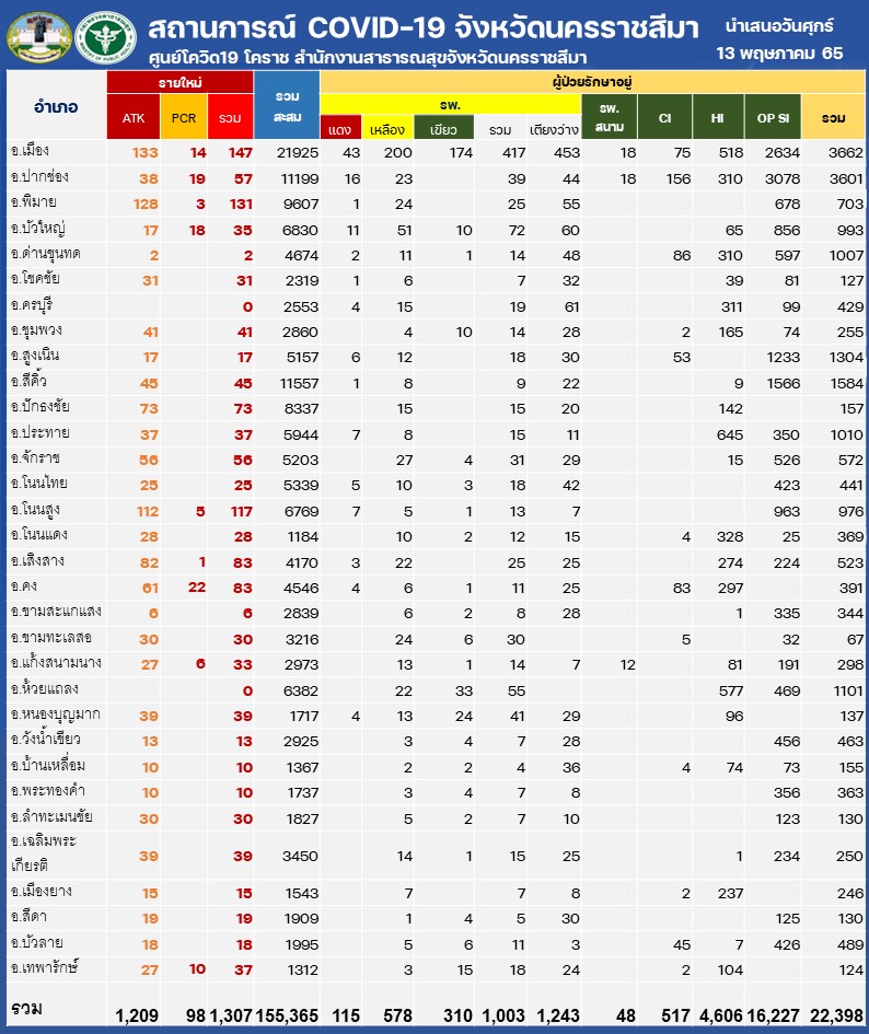 คณะกรรมการโรคติดต่อจังหวัดนครราชสีมา ได้เปิดเผยถึงสถานการณ์การระบาดของไวรัสโควิด-19 พบว่าวันนี้ในพื้นที่ จ.นครราชสีมา มีผู้ติดเชื้อรายใหม่เพิ่มขึ้น จำนวน 1,307 ราย โดยแบ่งเป็นผลจากการตรวจ ATK จำนวน 1,209 ราย และผลจากการตรวจ RT PCR จำนวน 98 ราย และเสียชีวิต จำนวน 3 ราย โดยผู้เสียชีวิตทั้ง 3 ราย เป็นผู้สูงอายุ 79, 85 และ 96 ปี