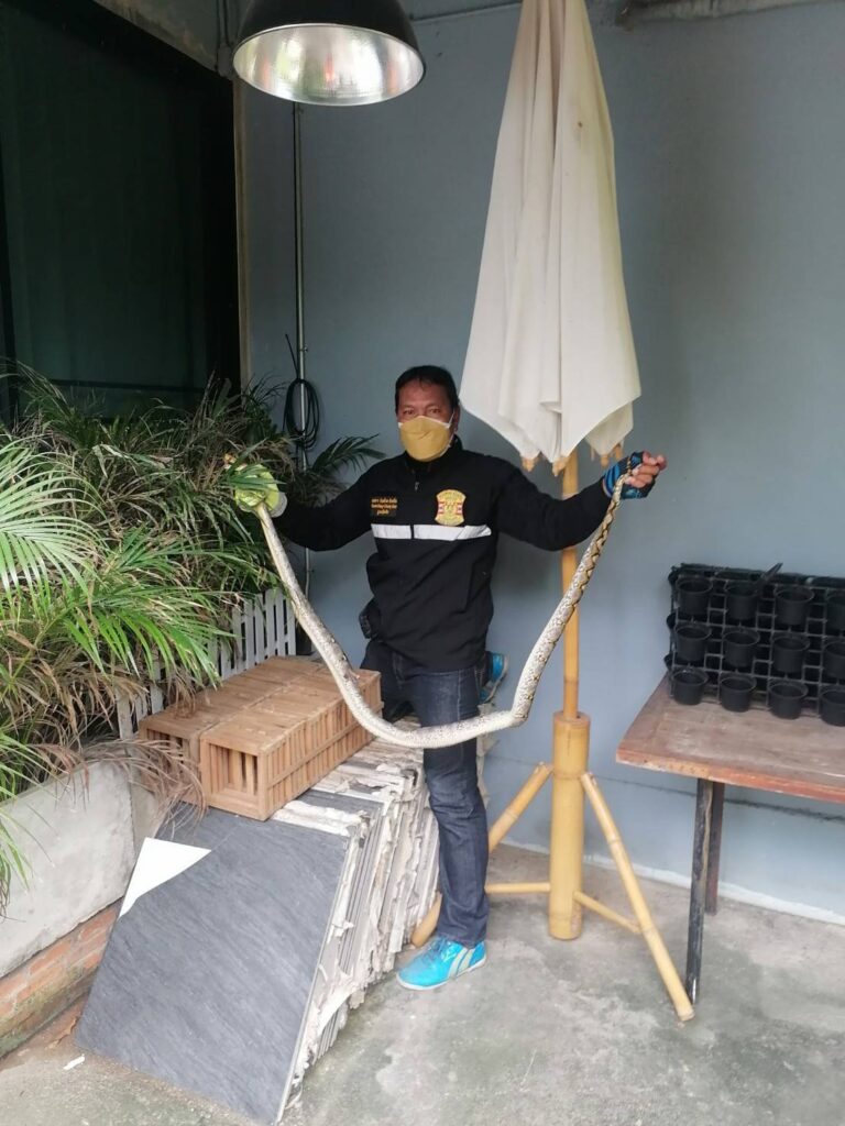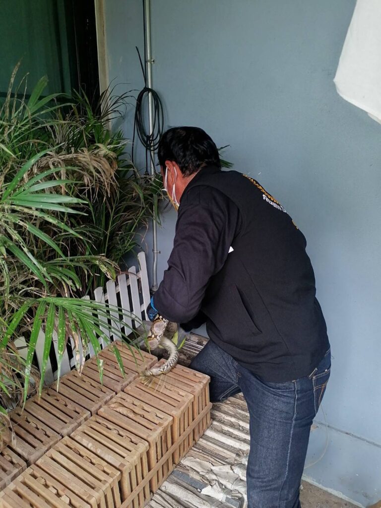 อาสาร่วมด้วยฐานคุ้มภัย เข้าช่วยเหลือจับงู ได้รับแจ้งจากประชาชนขอความช่วยเหลือ มีงูเลื้อยเข้าไปในบ้าน ซอยหทัยราษฎร์ 31 เขตมีนบุรี กรุงเทพฯ ตรวจสอบพบงูเหลือมเลื้อยซุกตัวอยู่ใต้แผ่นกระเบื้องข้างบ้าน อาสาฯ จึงนำอุปกรณ์คล้องจับไว้ได้ ก่อนนำไปปล่อยคืนสู่ธรรมชาติต่อไป
