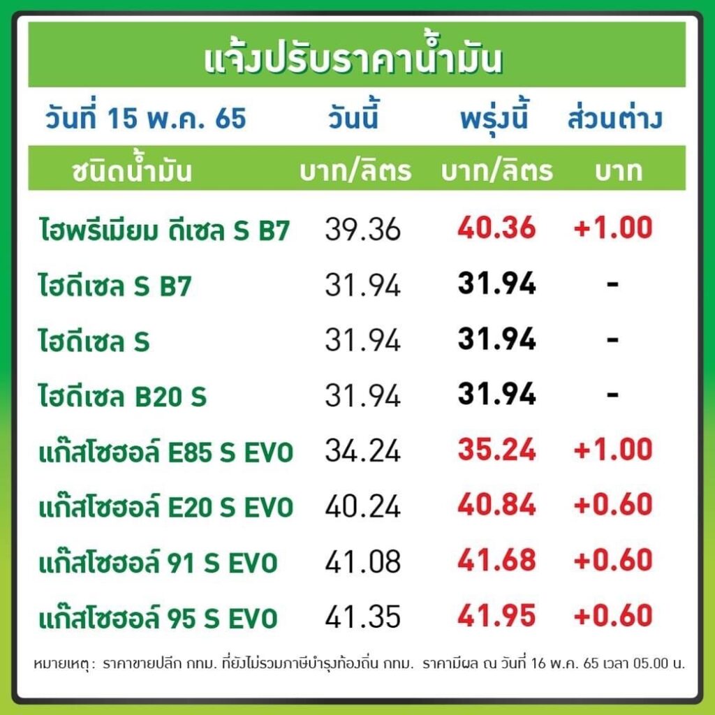 บมจ.ปตท.น้ำมันและการค้าปลีก (OR) และ บมจ.บางจาก คอร์ปอเรชั่น (BCP) ประกาศปรับขึ้นราคาขายปลีกน้ำมันกลุ่มเบนซินและแก๊สโซฮอล์ทุกชนิด 60 สต.ต่อลิตร เว้น E85 และ ดีเซลพรีเมียม ปรับขึ้น 1 บาทต่อลิตร มีผล 16 พ.ค.2565 ตั้งแต่เวลา 05.00 น. เป็นต้นไป