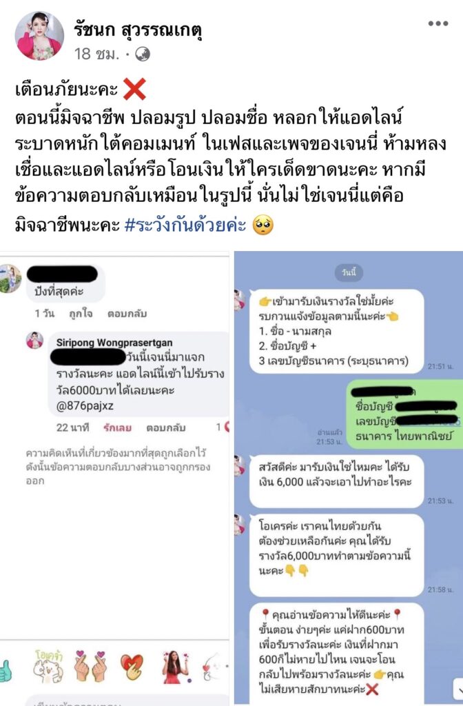 อย่างล่าสุด นักร้องสาวเจ้าของค่ายดัง “เจนนี่ รัชนก หรือ เจนนี่ ได้หมดถ้าสดชื่น” ก็ออกโรงโพสต์เตือนภัยแฟนคลับ หลังมีพวกมิจฉาชีพ นำรูปและชื่อไปแอบอ้าง โพสต์ใต้คอมเมนต์ ให้คนแอดไลน์ร่วมลุ้นรางวัล แต่หลอกให้โอนเงิน
