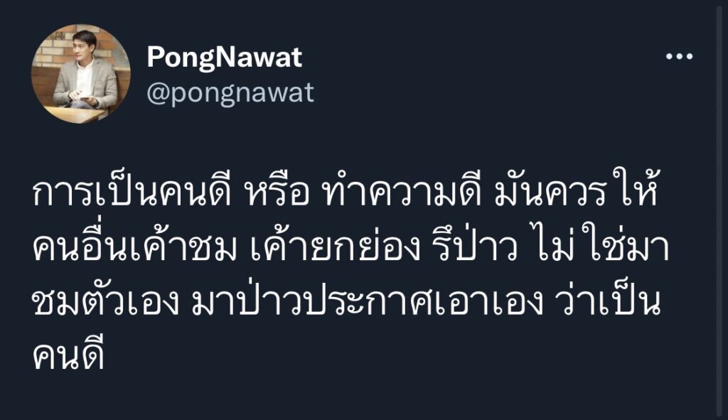 ไม่รู้ว่าหมายถึงใคร แต่อ่านแล้วถึงกับสะดุ้งเลยทีเดียว เมื่อพระเอกหนุ่ม “ป้อง ณวัฒน์” โพสต์ข้อความลอยๆผ่านทวิตเตอร์ว่า “การเป็นคนดี หรือ ทำความดี มันควรให้คนอื่นเค้าชม เค้ายกย่อง รึป่าว ไม่ใช่มาชมตัวเอง มาป่าวประกาศเอาเอง ว่าเป็นคนดี”