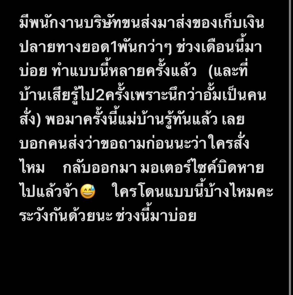 โดยเจ้าตัวได้ระบุว่า “มีพนักงานบริษัทขนส่งมาส่งของเก็บเงินปลายทางยอด1พันกว่าๆ ช่วงเดือนนี้มาบ่อย ทำแบบนี้หลายครั้งแล้ว (และที่บ้านเสียรู้ไป2ครั้งเพราะนึกว่าอั้มเป็นคนสั่ง) พอมาครั้งนี้แม่บ้านรู้ทันแล้ว เลยบอกคนส่งว่าขอถามก่อนนะว่าใครสั่งไหม กลับออกมา มอเตอร์ไซค์บิดหายไปแล้วจ้า ใครโดนแบบนี้บ้างไหมคะ ระวังกันด้วยนะ ช่วงนี้มาบ่อย ”