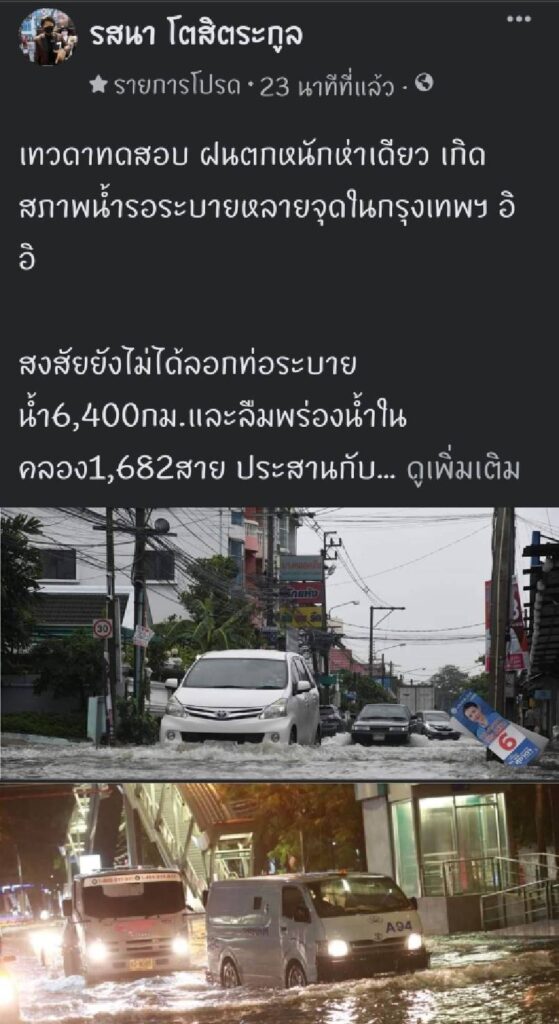 น.ส.รสนา โตสิตระกูล ผู้สมัครผู้ว่าฯกทม.หมายเลข 7 ในนามอิสระ ระบุข้อความผ่านเฟซบุ๊คส่วนตัวถึงสภาพน้ำท่วมถนนหลังจาก เกิดฝนตกหนักในช่วงกลางคืนที่ผ่านมา ว่าเทวดาทดสอบ ฝนตกหนักห่าเดียว เกิดสภาพน้ำรอระบายหลายจุดในกรุงเทพฯ