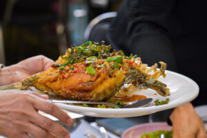 ศิธา ทิวารี สั่งเมนู “ปลากระพง 2 ใจ” ปลากระพงเป็นปลาทะเลและก็มีอยู่น้ำกร่อย แต่ไม่ว่าจะน้ำกร่อยหรือน้ำจืดทุกอย่างที่เราทิ้งไป กทมฯ เอาไปฝั่งกลบ ถึงเวลาฝนตกมาพวกสารเคมีมันก็จะลงไปในคลองในแม่น้ำและในทะเลแล้วก็อยู่ที่ตัวปลา ทุกวันนี้คนไทยเราโดยเฉพาะคน กทมฯ เป็นมะเร็งเยอะที่สุด เพราะว่าทิ้งขยะกันมักง่าย เพราะฉะนั้นเวลาเราไปกินปลาเราก็จะได้สารพวกนี้เข้ามา กระพง 2 ใจ ถามว่าแล้วดียังไง คือเราก็เป็นห่วงเรื่องสุขภาพคนกรุงเทพฯใช่ไหม แต่พอมาลงสมัครรับเลือกตั้งช้า เขามีเจ้าเข้าเจ้าของกันแล้ว บางคนก็หมั้นหมายกันไปแล้ว ทีนี่จะให้มาแต่งกับเราก็คิดหนักไง เพราะฉะนั้นก็เลยบอกว่ากระพง 2 ใจก็ขอแบ่งสักใจหนึ่งมาให้ศิธาหน่อยแล้วกัน