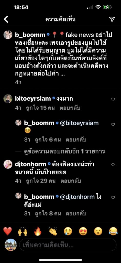 โดย บูม ได้ออกมาโพสต์ในอินสตาแกรมเมื่อวันก่อน เตือนภัยก่อนที่จะมีคนหลงเชื่อ ว่าทางแบรนด์ดังกล่าวนำรูปไปใช้โดยไม่ได้รับอนุญาต และตัวเองก็ไม่ได้มีส่วนเกี่ยวข้องกับเรื่องนี้ วันนี้จึงต้องมาแจ้งความดำเนินคดีตามกฏหมายกับแบรนด์ดังกล่าว