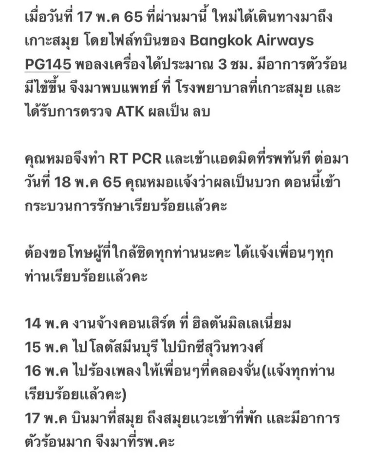 โดย “ใหม่” ได้แจ้งข่าวการติดเชื้อโควิด-19 ของตนเองผ่านอินสตาแกรมส่วนตัว พร้อมข้อความระบุว่า “เมื่อวันที่ 17 พ.ค 65 ที่ผ่านมานี้ ใหม่ได้เดินทางมาถึงเกาะสมุย โดยไฟล์ทบินของ Bangkok Airways PG145 พอลงเครื่องได้ประมาณ 3 ชม. มีอาการตัวร้อน มีไข้ขึ้น จึงมาพบแพทย์ ที่ โรงพยาบาลที่เกาะสมุย และได้รับการตรวจ ATK ผลเป็นลบ คุณหมอจึงทำ RT PCR และเข้าแอดมิดที่รพ.ทันที ต่อมา วันที่ 18 พ.ค. 65 คุณหมอแจ้งว่าผลเป็นบวก ตอนนี้เข้ากระบวนการรักษาเรียบร้อยแล้วค่ะ ต้องขอโทษผู้ที่ใกล้ชิดทุกท่านนะคะ ได้แจ้งเพื่อน ๆ ทุกท่านเรียบร้อยแล้วค่ะ วันที่ 14 พ.ค. งานจ้างคอนเสิร์ต ที่ ฮิลตันมิลเลเนี่ยม /15 พ.ค. ไป โลตัสมีนบุรี ไปบิกชีสุวินทวงศ์ / 16 พ.ค. ไปร้องเพลงให้เพื่อน ๆ ที่คลองจั่น (แจ้งทุกท่านเรียบร้อยแล้วค่ะ) /17 พ.ค. บินมาที่สมุย ถึงสมุยแวะเข้าที่พัก และมีอาการตัวร้อนมาก จึงมาที่รพ.ค่ะ กราบขออภัยด้วยนะคะ”