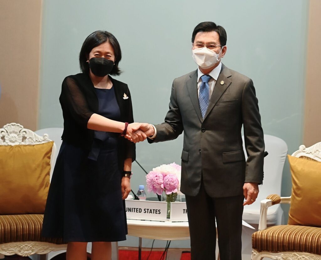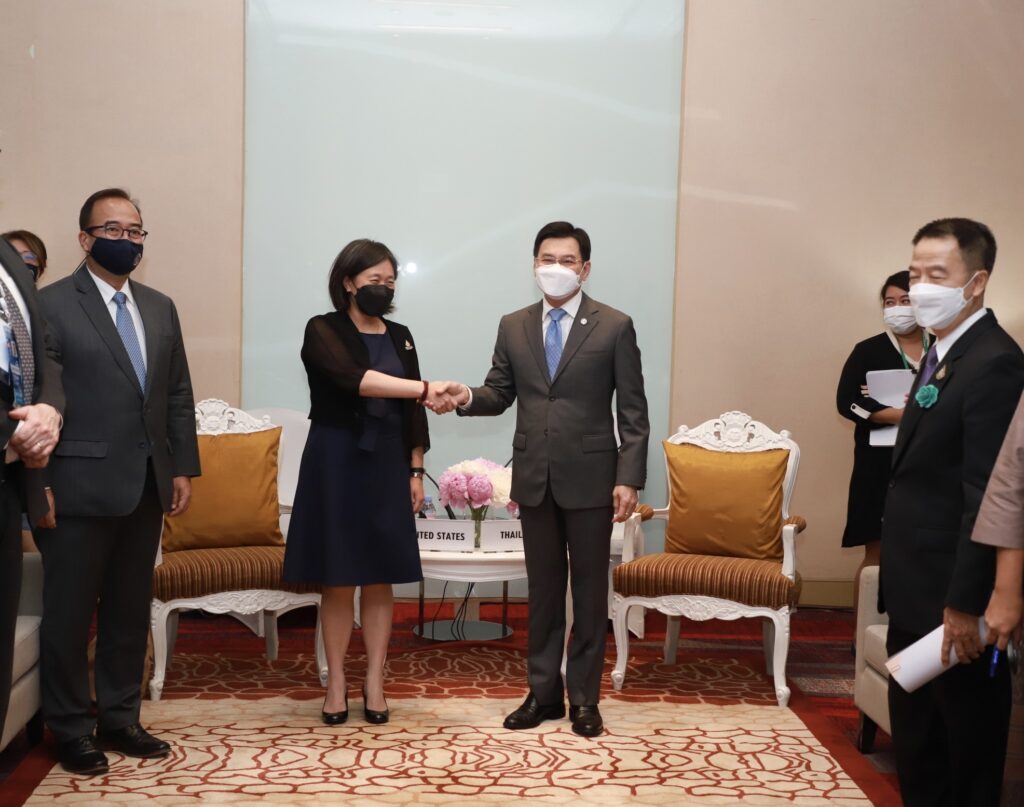 นายจุรินทร์ ลักษณวิศิษฏ์ รองนายกรัฐมนตรีและรัฐมนตรีว่าการกระทรวงพาณิชย์ แถลงผลการหารือทวิภาคี กับนางแคทเธอรีน ไท ผู้แทนการค้าสหรัฐฯ โดยรองนายกรัฐมนตรี ระบุว่า มูลค่าการค้าระหว่างไทยกับสหรัฐฯ ปี 2564 มีมูลค่าการค้าระหว่างการ 56,000 ล้านเหรียญสหรัฐ โดยสหรัฐเป็นคู่ค้าสำคัญลำดับที่ 3 ของไทย รองจากจีนและญี่ปุ่น ซึ่งไทยได้ดุลสหรัฐ และสินค้าส่งออกสำคัญ ได้แก่ คอมพิวเตอร์และอุปกรณ์ ผลิตภัณฑ์ยาง อัญมณีและเครื่องประดับ รถยนต์และอุปกรณ์ยานยนต์