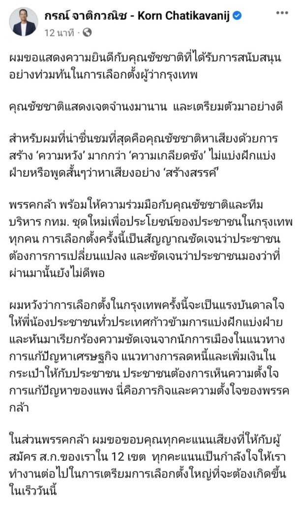 นายกรณ์ จาติกวณิช หัวหน้าพรรคกล้า ระบุข้อความผ่านเฟซบุ๊กส่วนตัว “กรณ์ จาติกวณิช – Korn Chatikavanij” แสดงความยินดีกับนายชัชชาติ สิทธิพันธุ์ผู้สมัครรับเลือกตั้งผู้ว่า กทม. หลังคะแนนยังไม่เป็นทางการนำมาเป็นอันดับ 1 ว่าตนขอแสดงความยินดีกับคุณชัชชาติที่ได้รับการสนับสนุนอย่างท่วมท้นในการเลือกตั้งผู้ว่ากรุงเทพ นายชัชชาติแสดงเจตจำนงมานาน และเตรียมตัวมาอย่างดี