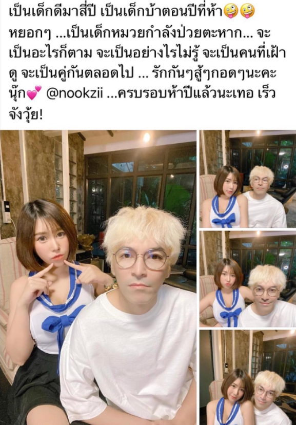 ล่าสุด “ปู แบล็คเฮด” ได้ออกมาโพสต์ความรู้สึกผ่านอินสตราแกรมส่วนตัว เหมือนเช่นเดิมทุกปี ในวันครบรอบความรัก 5 ปี โดยครั้งนั้นมีแคปชั่นว่า “เป็นเด็กดีมา 4 ปี เป็นเด็กบ้าตอนปีที่ห้า หยอกๆ เป็นเด็กหมวยกำลังป่วยตะหาก จะเป็นอะไรก็ตาม จะเป็นอย่างไรไม่รู้ จะเป็นคนที่เฝ้าดู จะเป็นคู่กันตลอดไป รักกันสู้ๆกอดๆนะคะนุ๊ก @nookzii ครบรอบ 5 ปีแล้วนะเทอเร็วจังวุ้ย”