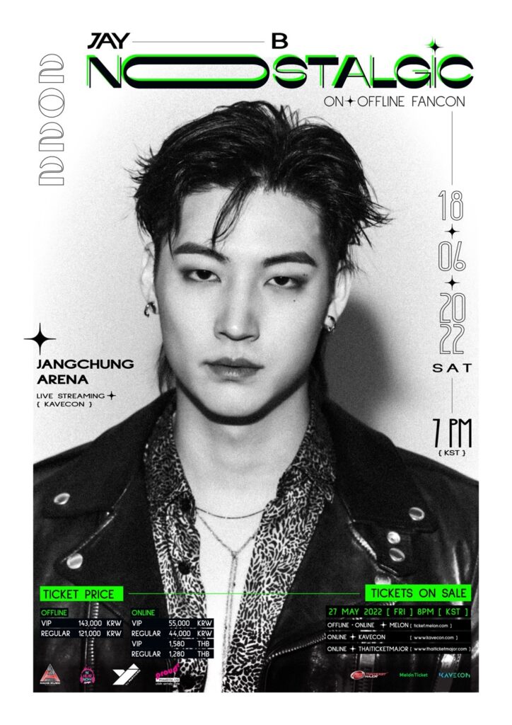 มาร่วมเป็นส่วนหนึ่งในหน้าความทรงจำระหว่าง JAY B (เจบี) และแฟนๆ ที่จะถูกจารึกไว้ตลอดไป ในโซโล่แฟนคอนเสิร์ต<2022 JAY B “NOSTALGIC” ON∙OFFLINE FANCON>จัดขึ้นทั้งในรูปแบบออฟไลน์ ที่ Jangchung Arena เกาหลีใต้ พร้อมรับชมการแสดงสดในรูปแบบออนไลน์พร้อมกันทั่วโลก ทาง KAVECON ในวันเสาร์ที่ 18 มิถุนายน 2565 เวลา 17.00 น. (เวลาไทย)บัตรจำหน่ายในวันศุกร์ที่ 27 พฤษภาคม เวลา 18:00 น. (เวลาไทย) ที่ช่องทาง Thaiticketmajorทุกสาขา