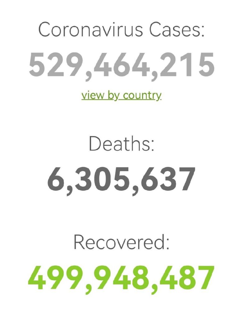 ตามเวลาประเทศไทย พบผู้ติดเชื้อทั่วโลก 529,464,215 ราย เพิ่มขึ้น 554,524ราย เสียชีวิต 6,305,637 ราย