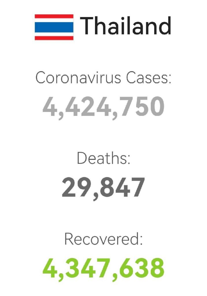 สำหรับประเทศไทย อยู่ลำดับที่ 24 พบผู้ติดเชื้อแล้ว 4,424,750 ราย เพิ่มขึ้น 5,013 ราย เสียชีวิต 29,847ราย เพิ่มขึ้น 33 ราย รักษาหาย 4,347,638ราย เพิ่มขึ้น 5,591 ราย