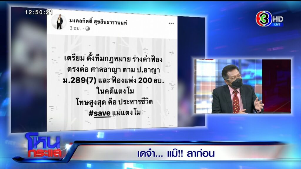 ส.ส.เต้ขึ้นแจ้งผู้บัญชาการไซเบอร์ ว่าคุณแม่มอบให้ฝ่ายกฎหมายพรรคศรีวิไลย์ดูแลทุกคดีต่อไป และเตรียมตั้งทีมกฎหมายร่างคำฟ้องตรงต่อศาลอาญา ตามป.อาญา ม.289(7) และฟ้องแพ่ง 200 ล้านบาทในคดีแตงโม โทษสูงสุดคือประหารชีวิต แฮชแท็กเซฟแม่แตงโม พี่ก็เปิดออกมาเลยว่าพี่ถอนตัวแล้ว?